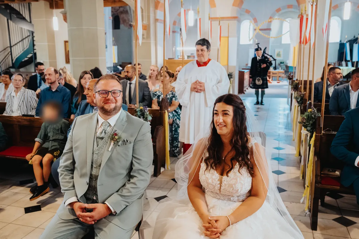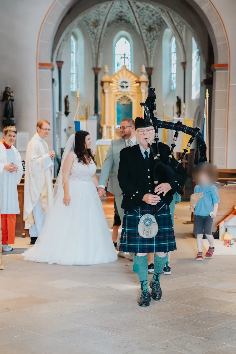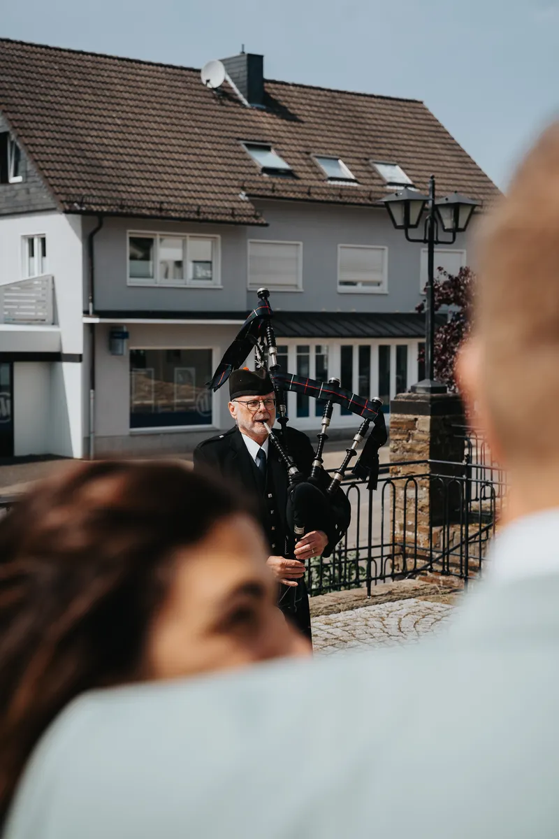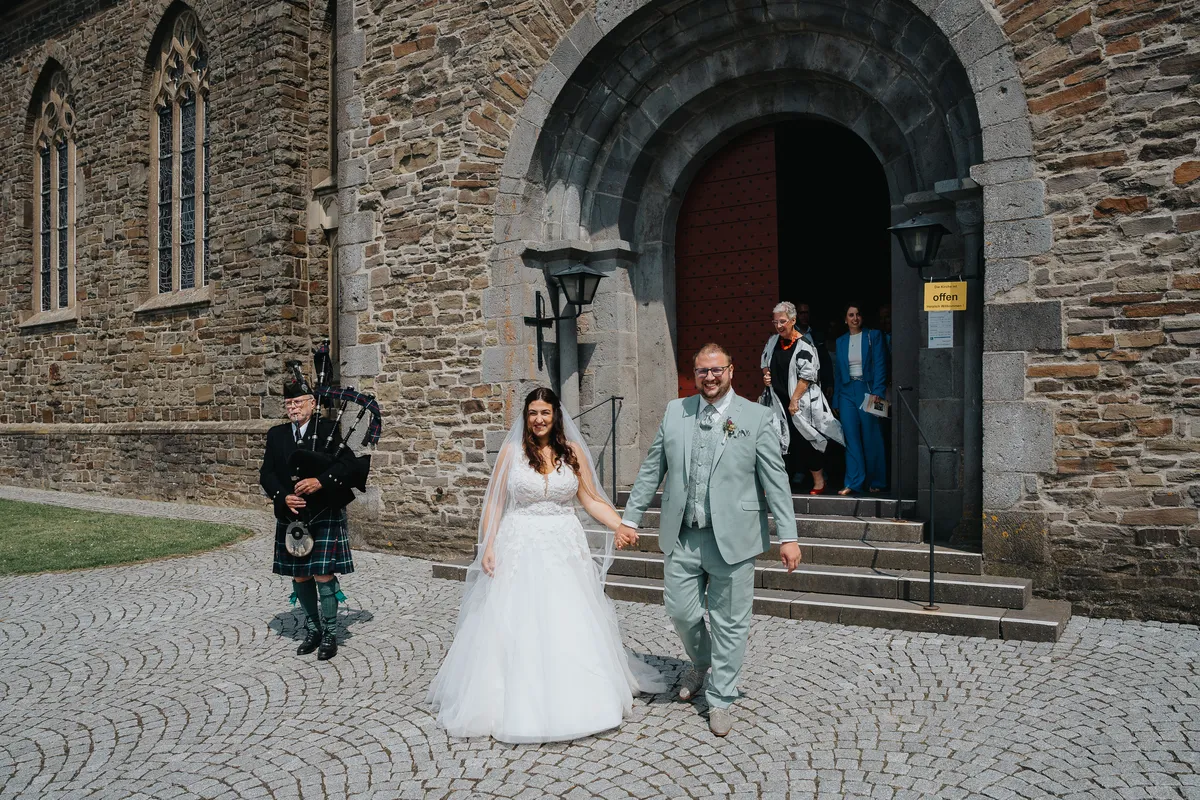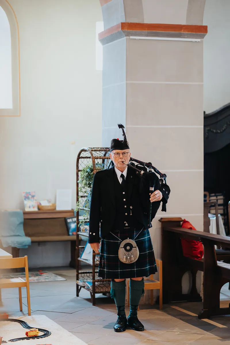 Beim Auszug folgte die große Überraschung: Ein Dudelsackspieler wartete hinten in der Kirche und sorgte für echtes Gänsehautgefühl – nicht nur beim Brautpaar, sondern auch bei allen Gästen.