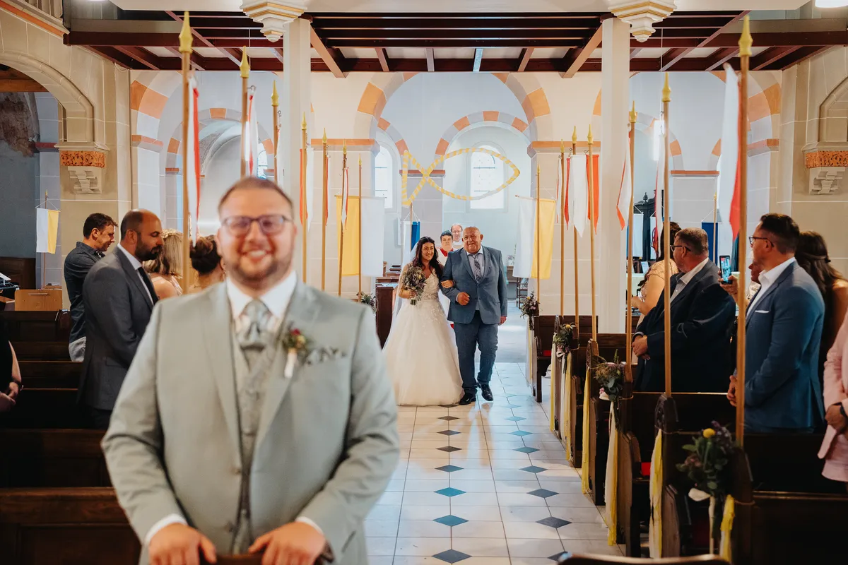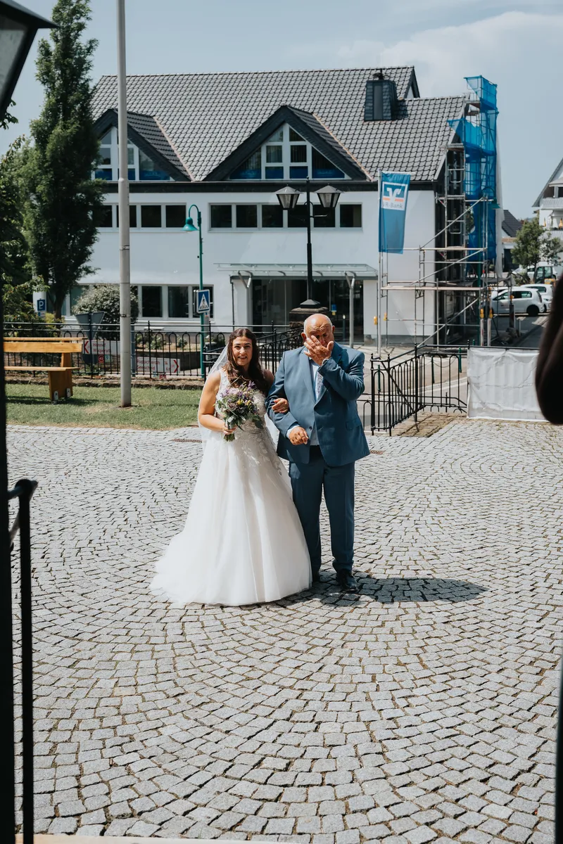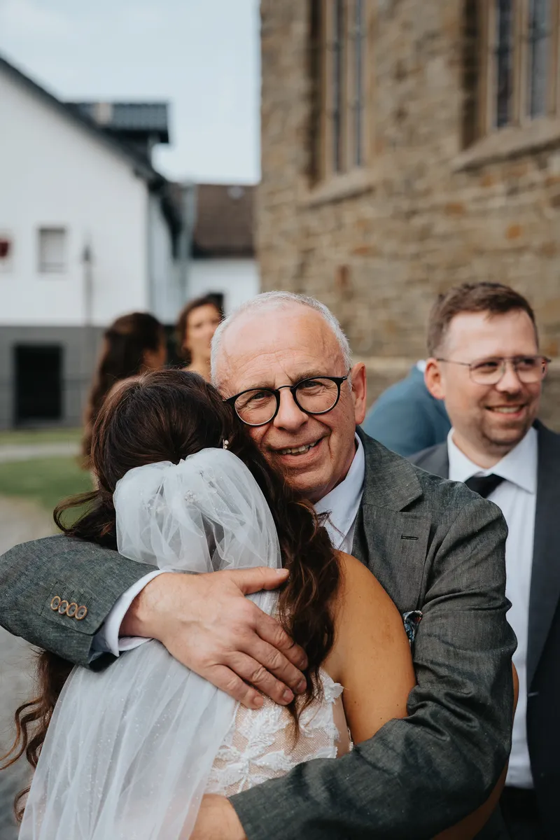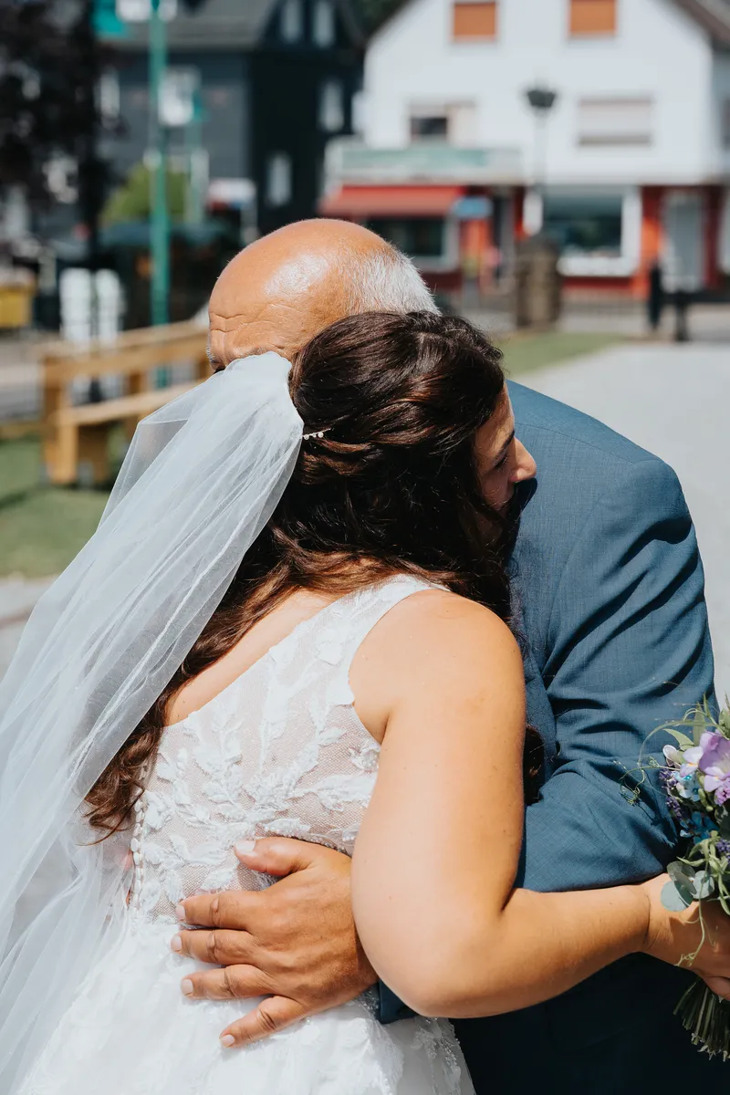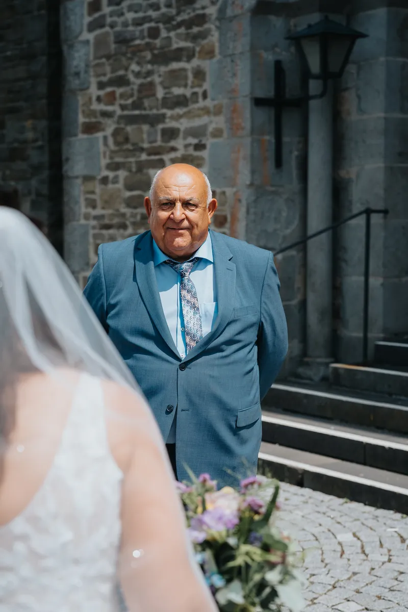 Am frühen Nachmittag ging es weiter zur kirchlichen Trauung in der Kirche St. Margareta in Neunkirchen-Seelscheid. Als Hochzeitsfotograf Neunkirchen‑Seelscheid bin ich nahe dran an den emotionalen Momenten – angefangen beim First Look mit Lenas Vater: Lena traf hier zum ersten Mal an diesem Tag auf ihren Vater im Brautkleid – ein kurzer First Look, der nicht gestellt war, sondern einfach so passierte.