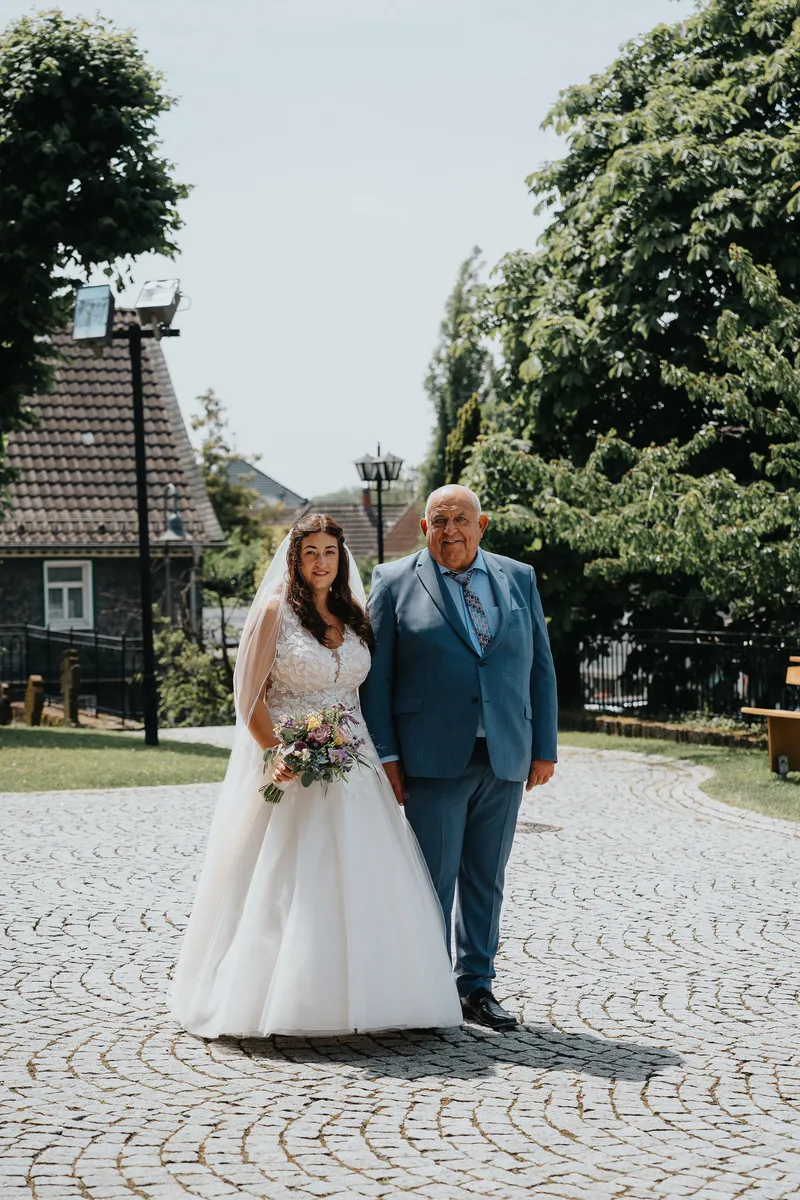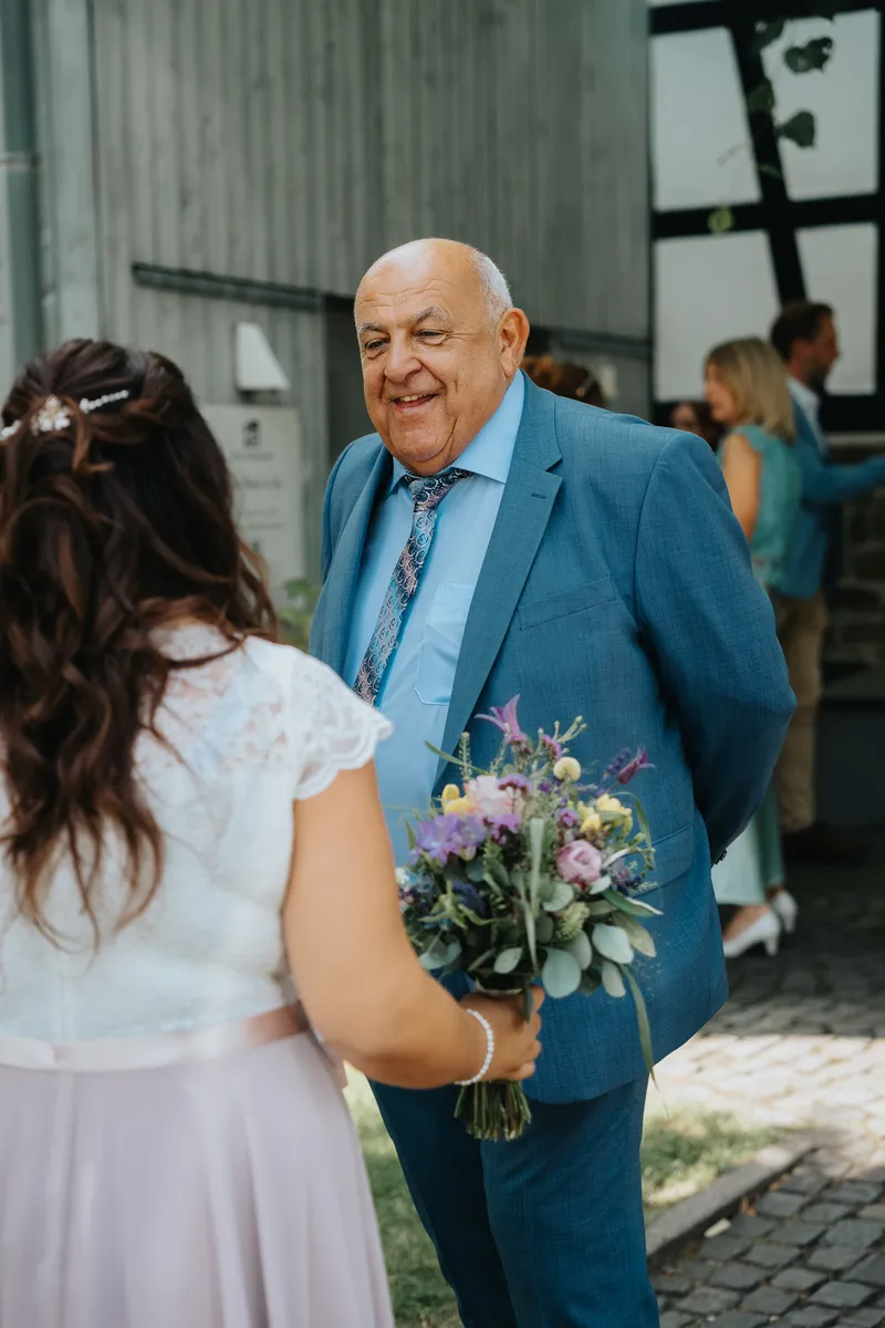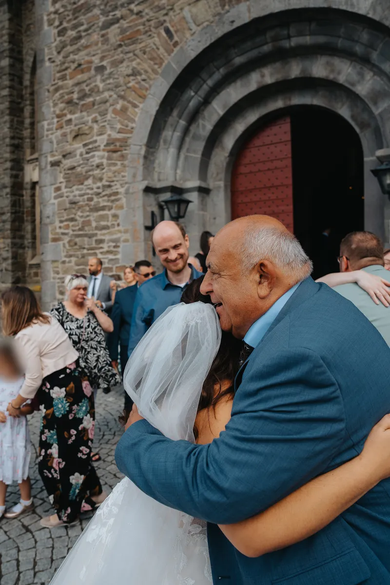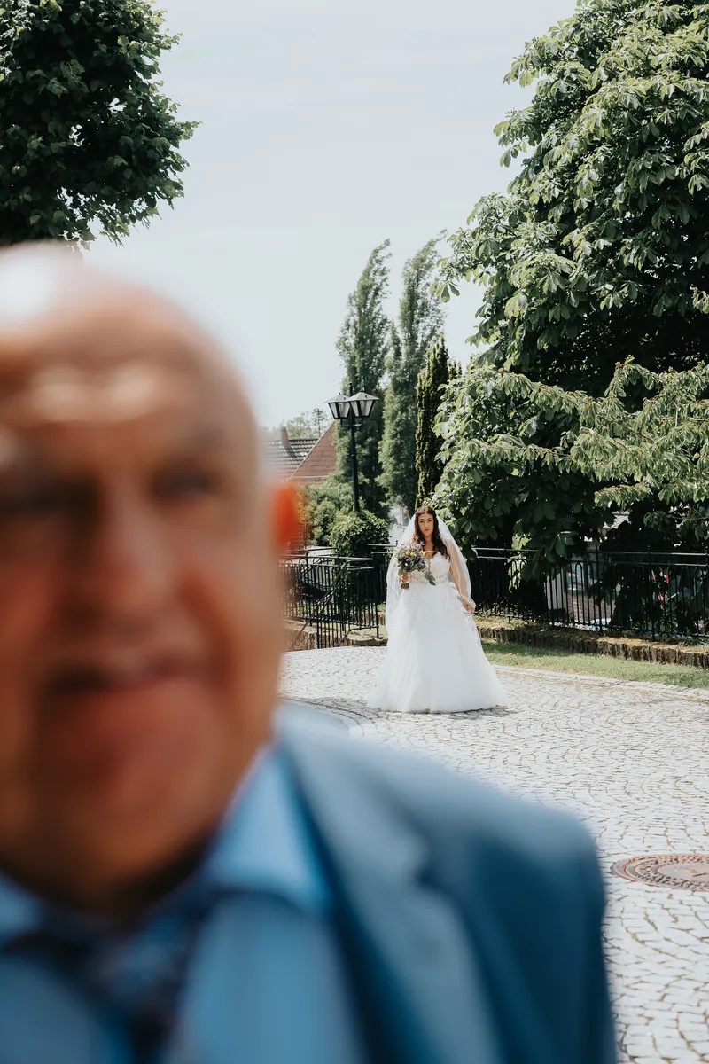 Am frühen Nachmittag ging es weiter zur kirchlichen Trauung in der Kirche St. Margareta in Neunkirchen-Seelscheid. Als Hochzeitsfotograf Neunkirchen‑Seelscheid bin ich nahe dran an den emotionalen Momenten – angefangen beim First Look mit Lenas Vater: Lena traf hier zum ersten Mal an diesem Tag auf ihren Vater im Brautkleid – ein kurzer First Look, der nicht gestellt war, sondern einfach so passierte.