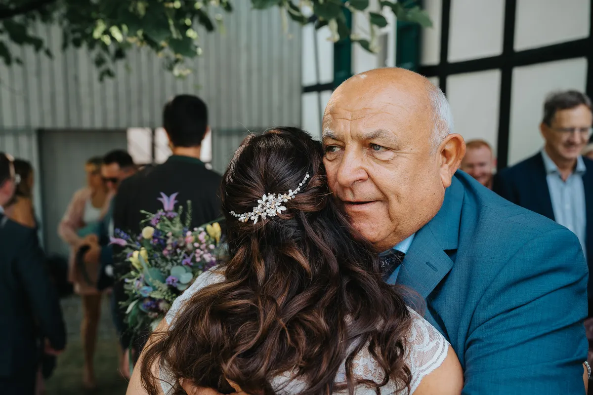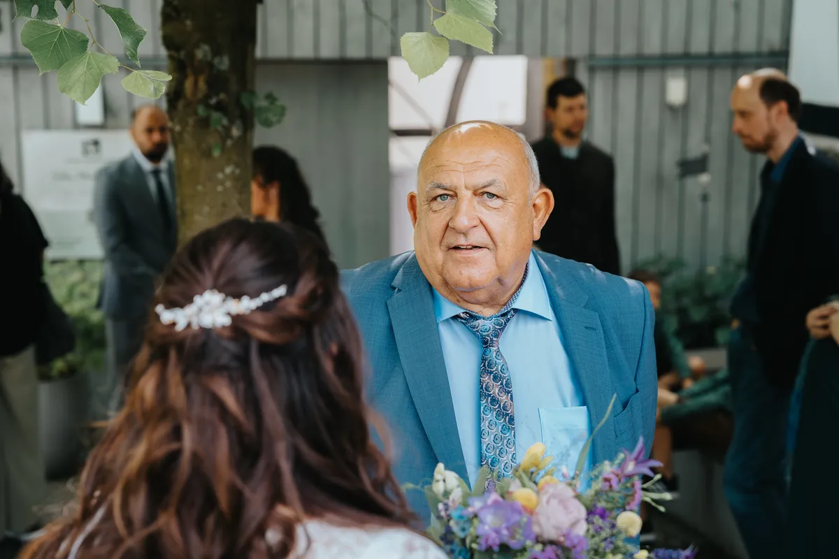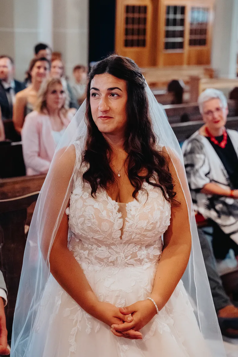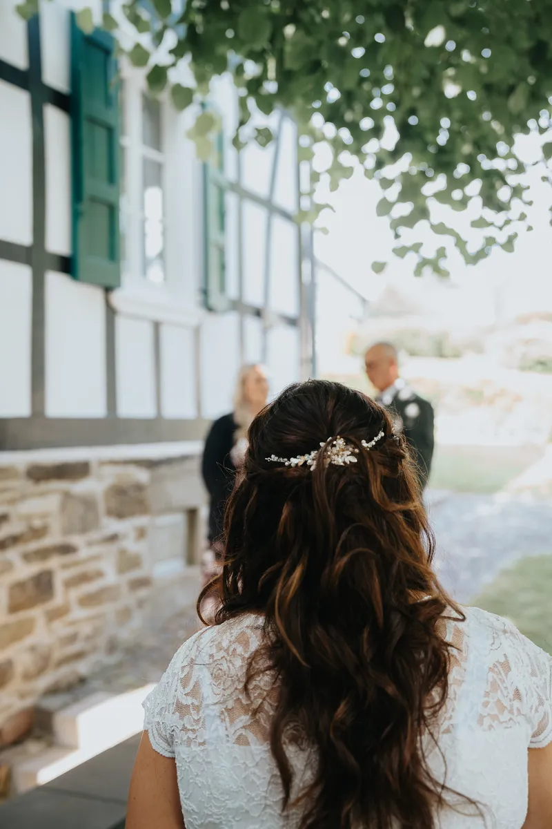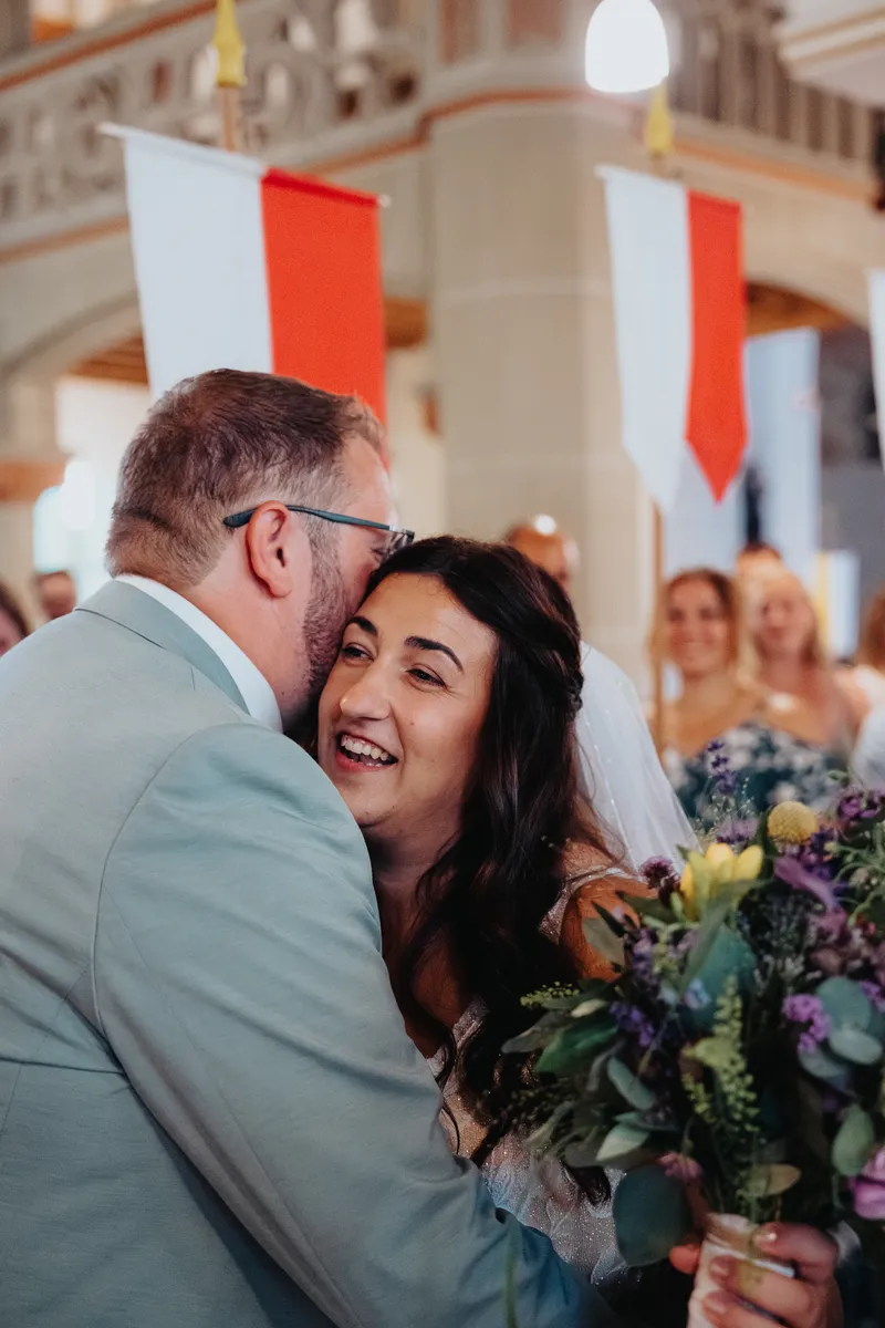 Am frühen Nachmittag ging es weiter zur kirchlichen Trauung in der Kirche St. Margareta in Neunkirchen-Seelscheid. Als Hochzeitsfotograf Neunkirchen‑Seelscheid bin ich nahe dran an den emotionalen Momenten – angefangen beim First Look mit Lenas Vater: Lena traf hier zum ersten Mal an diesem Tag auf ihren Vater im Brautkleid – ein kurzer First Look, der nicht gestellt war, sondern einfach so passierte.