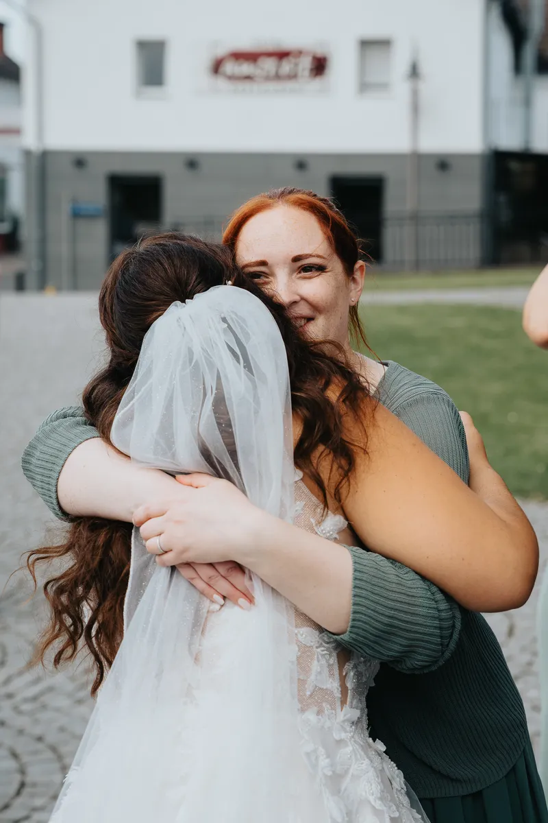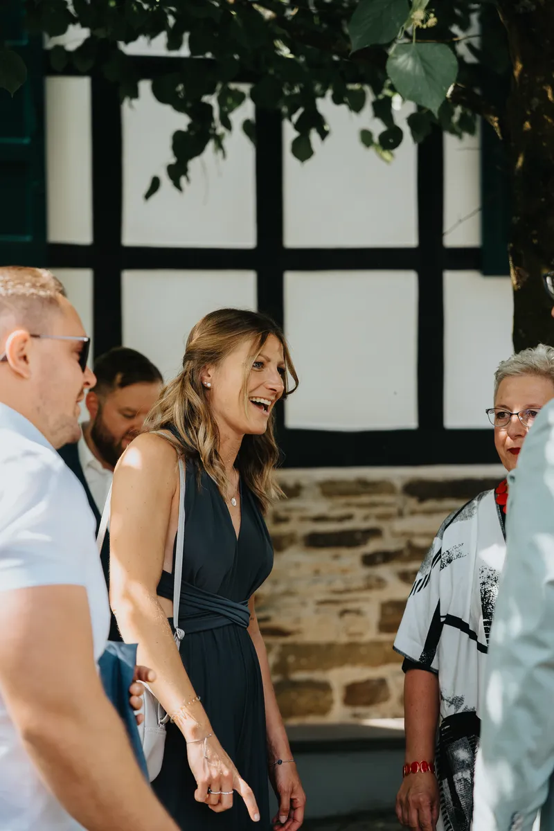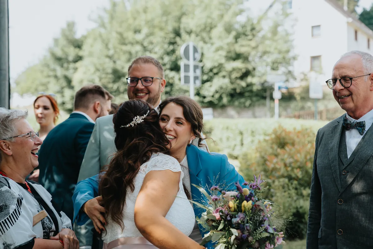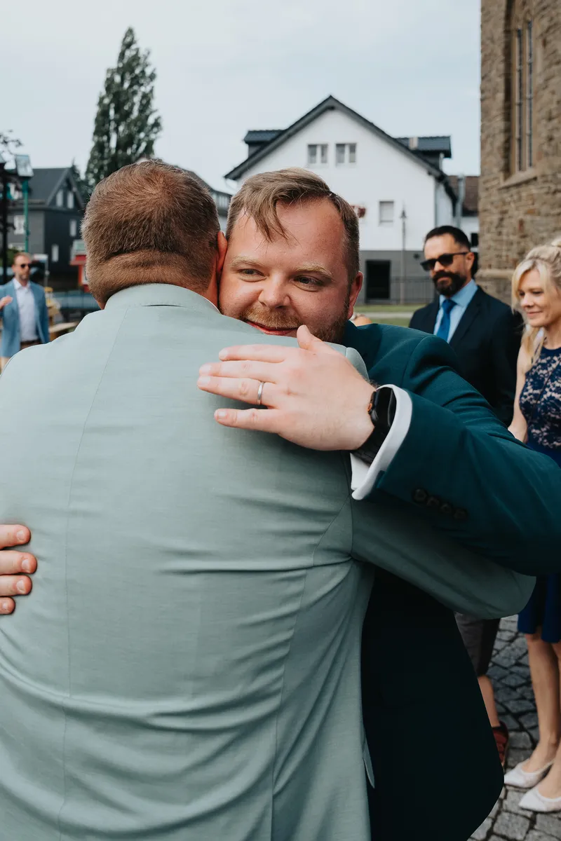 Draußen vor der Kirche war dann Zeit für Gratulationen, Umarmungen und das große Gruppenfoto mit allen Gästen. Für mich als Hochzeitsfotograf in Neunkirchen-Seelscheid war dieser Abschnitt besonders: weil er eine schöne Balance zwischen Tradition, Emotion und Überraschung geboten hat – und so viele ehrliche, starke Bilder entstanden sind.