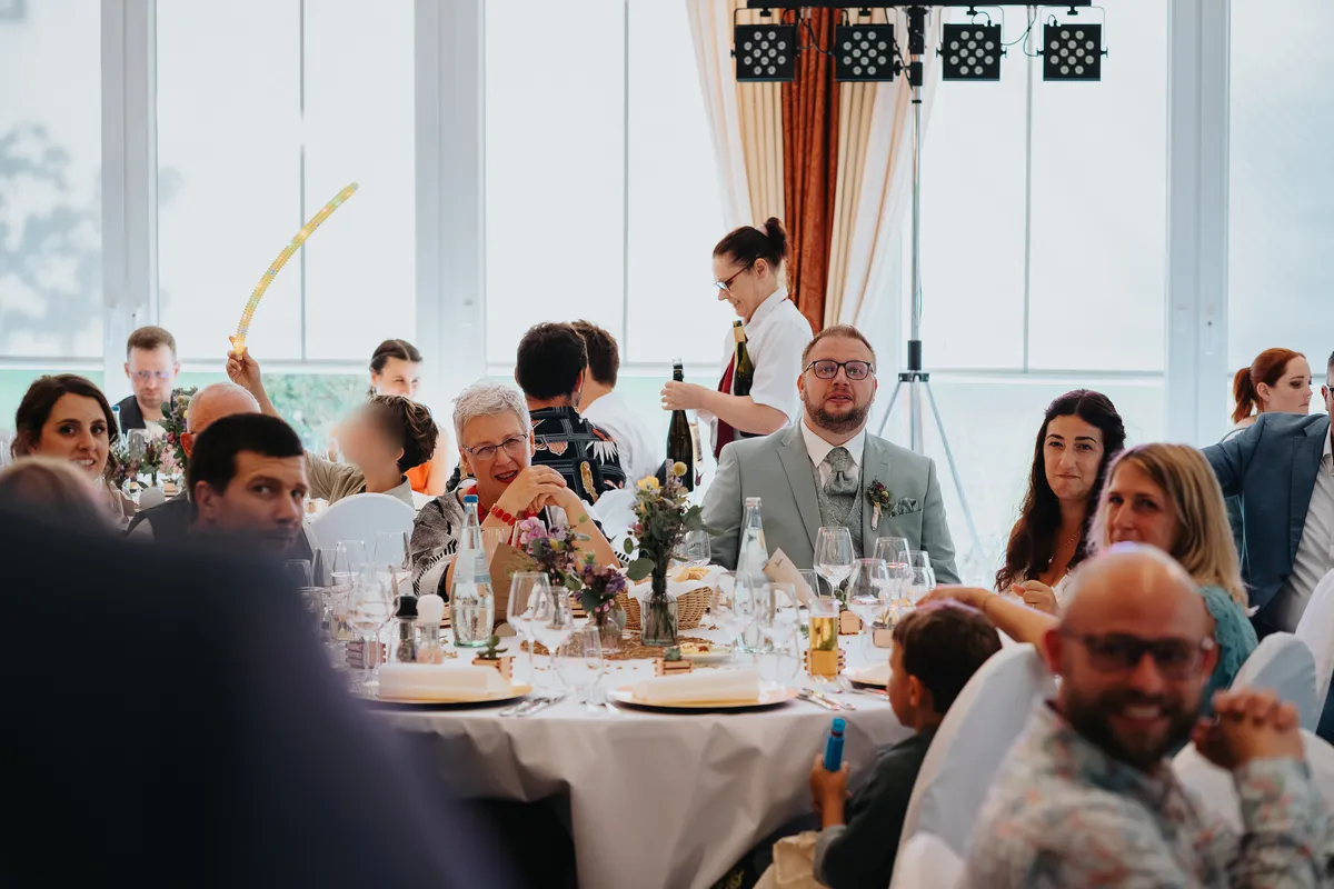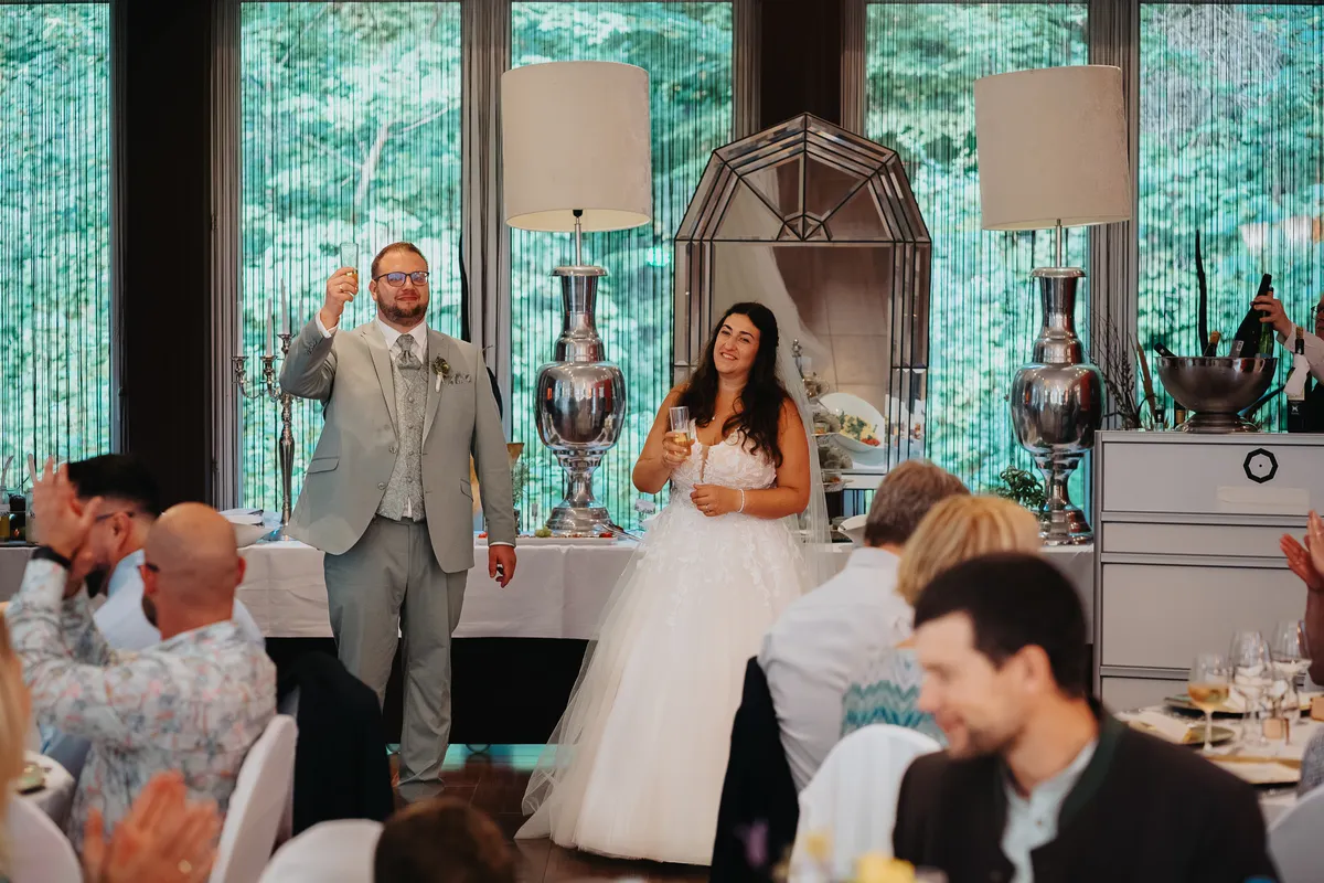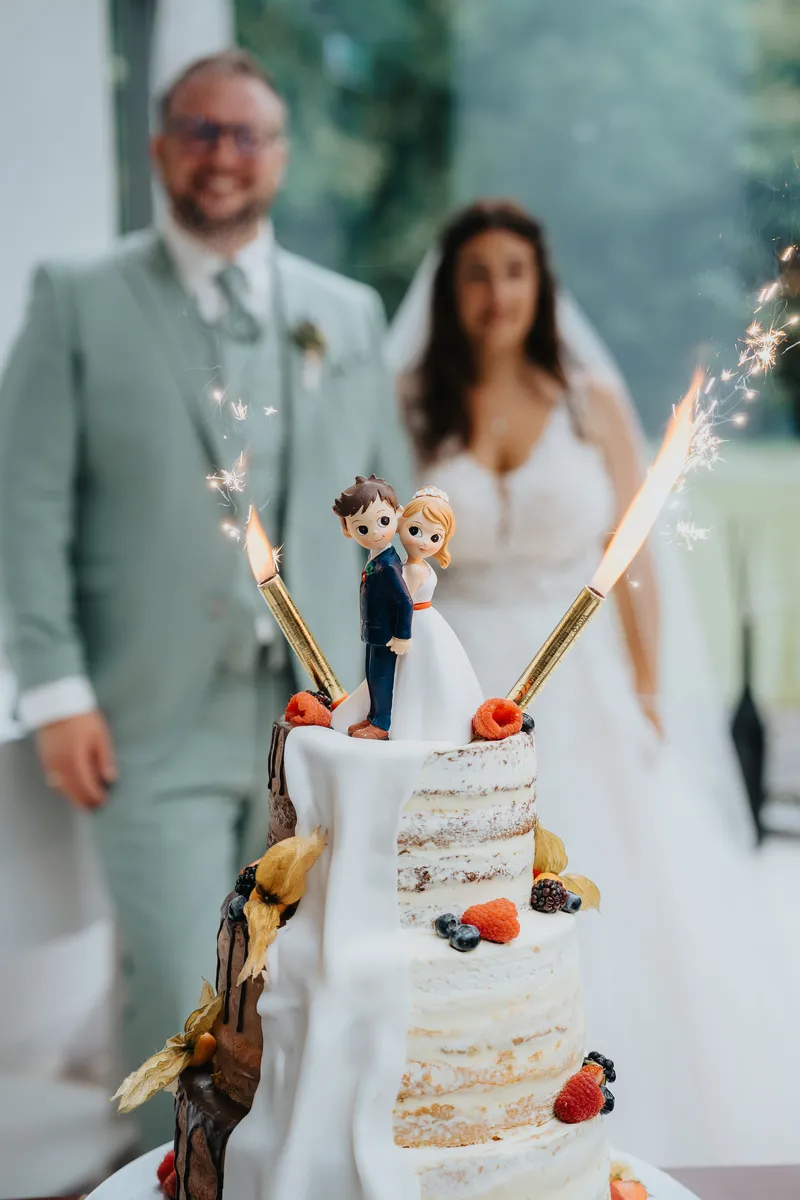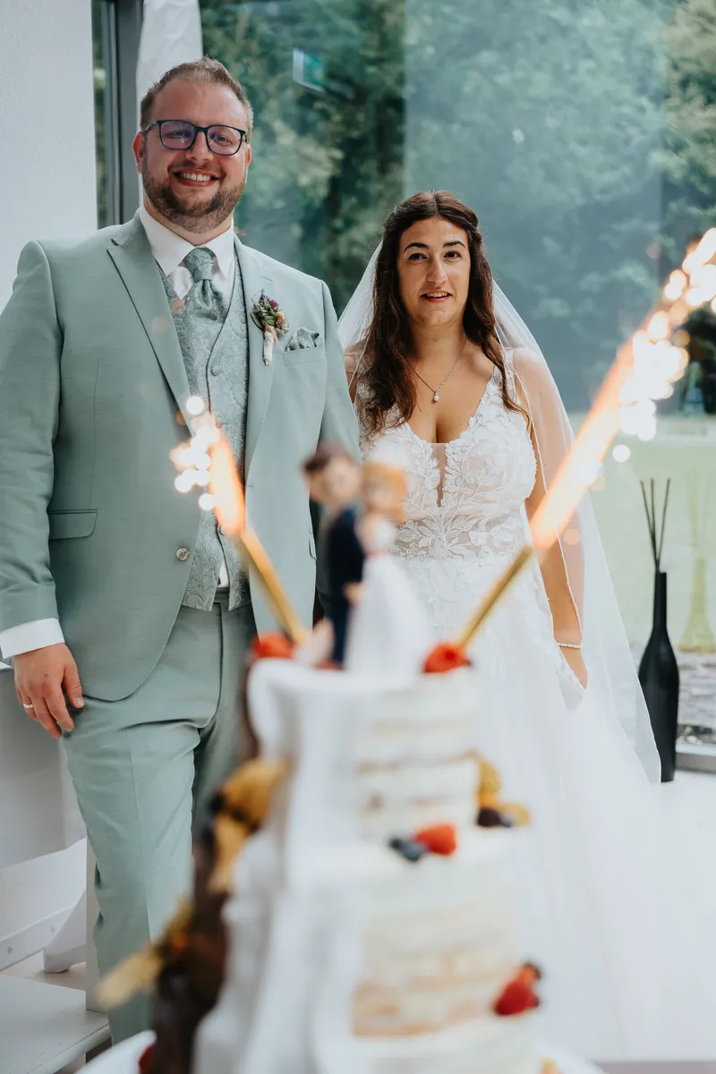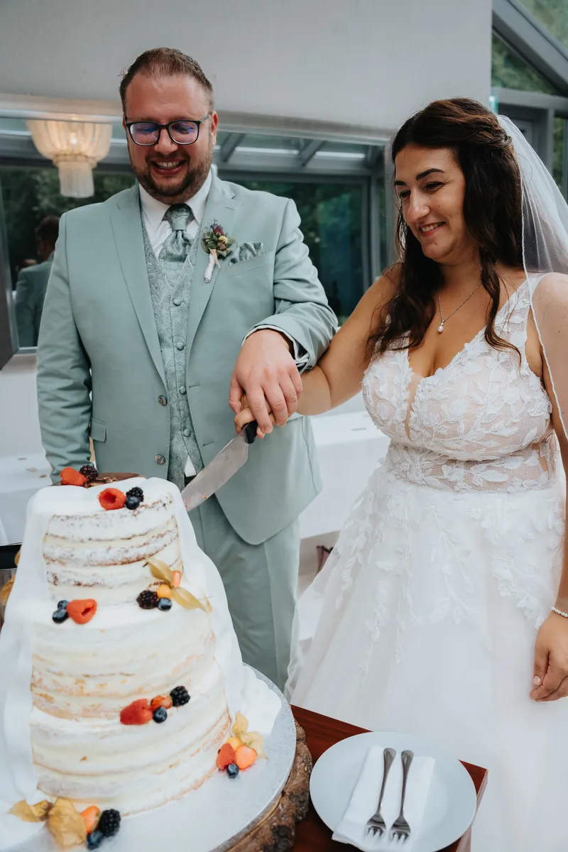 Ein weiteres Highlight folgte mit dem Kuchenanschnitt, bei dem Lena & Flo zusammen ihr süßes Highlight vorstellten – ein liebevoller Übergang von Empfang zur Feier. Danach öffnete sich der Blick in den festlich dekorierten Saal: Kronleuchter, florale Akzente und historische Elemente sorgten für echtes Sommerhochzeits-Feeling.