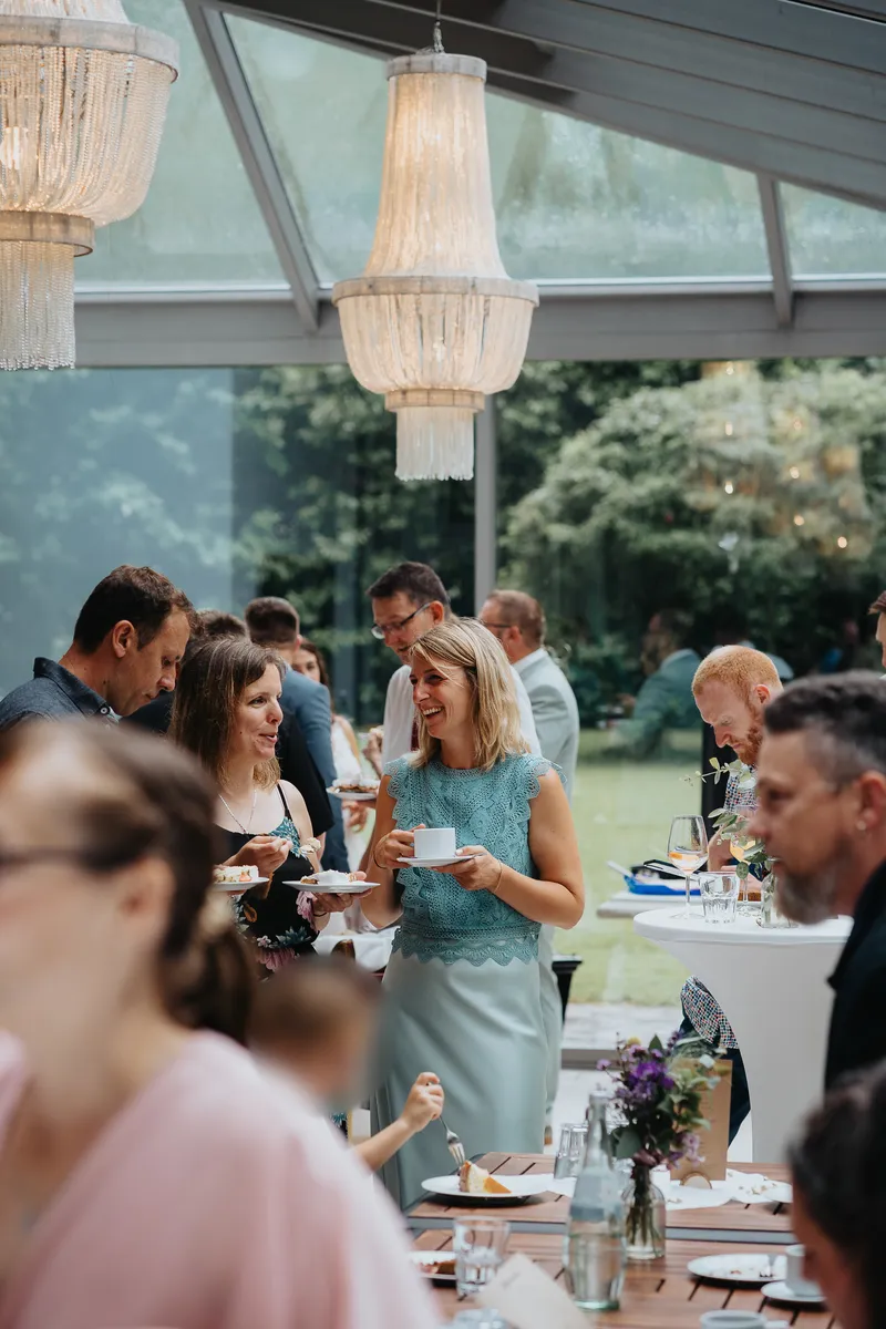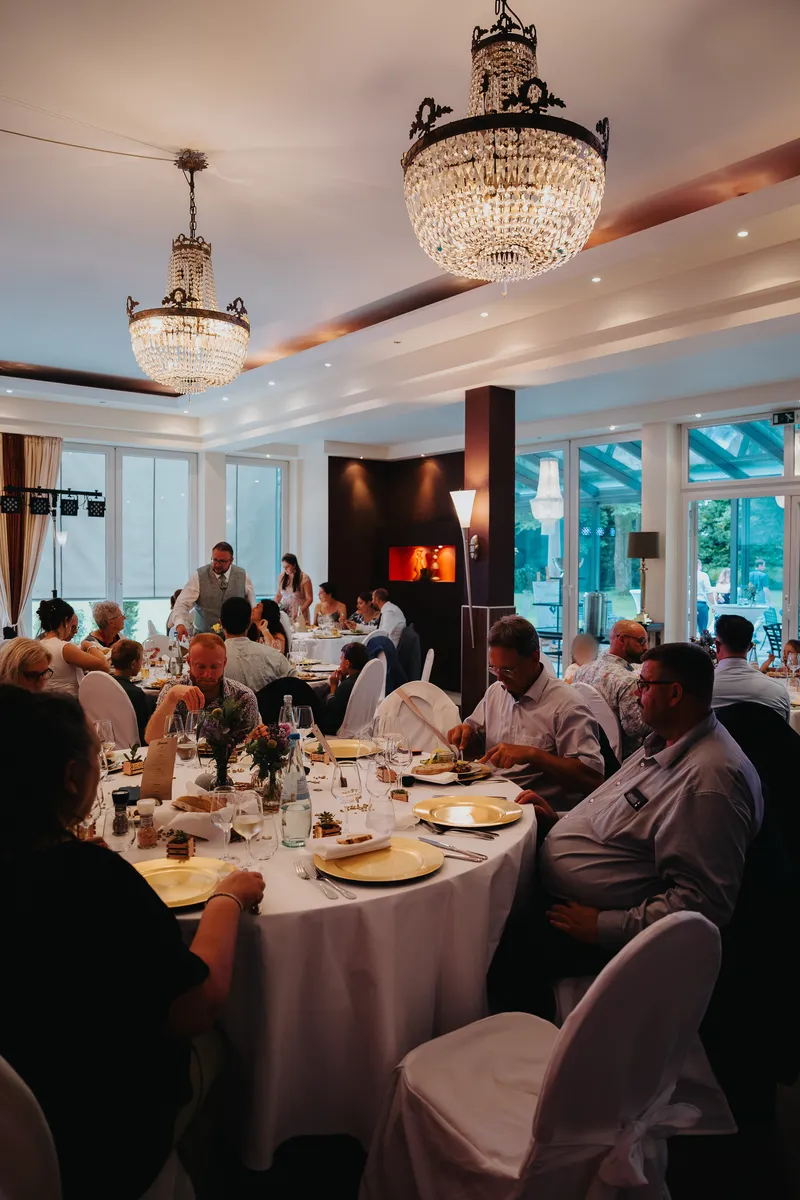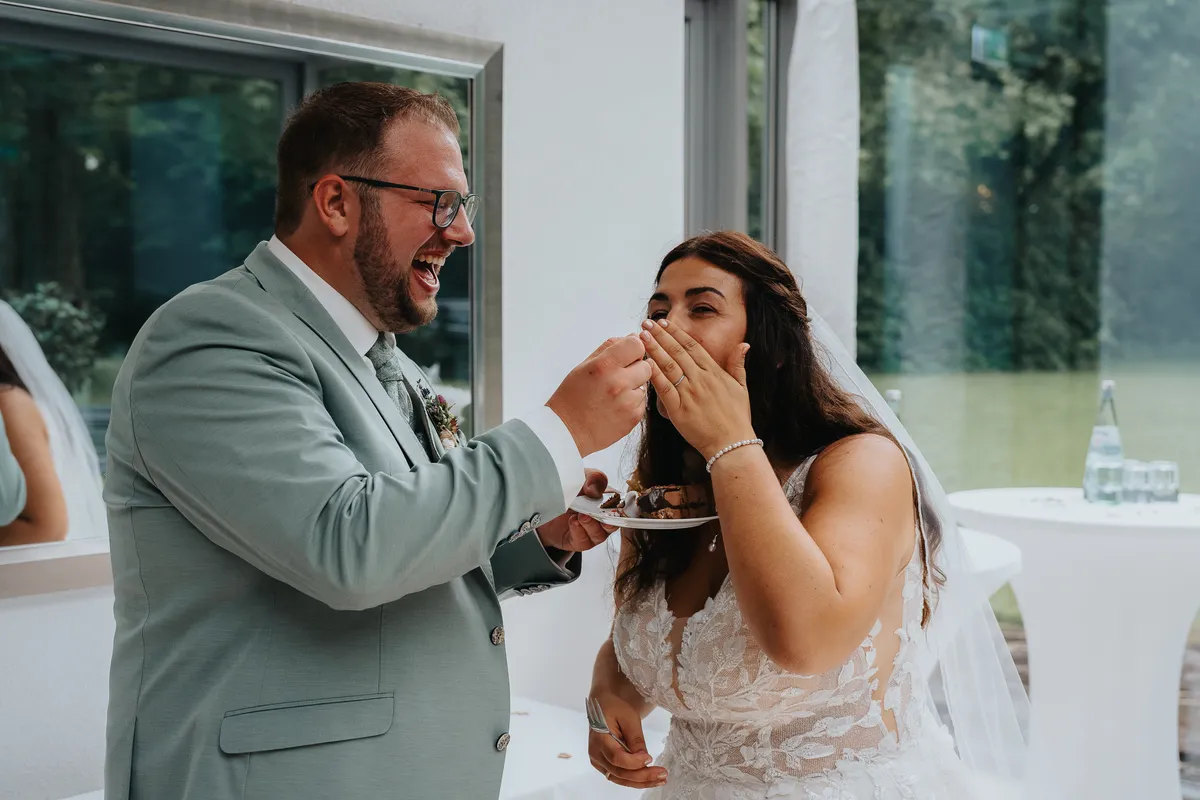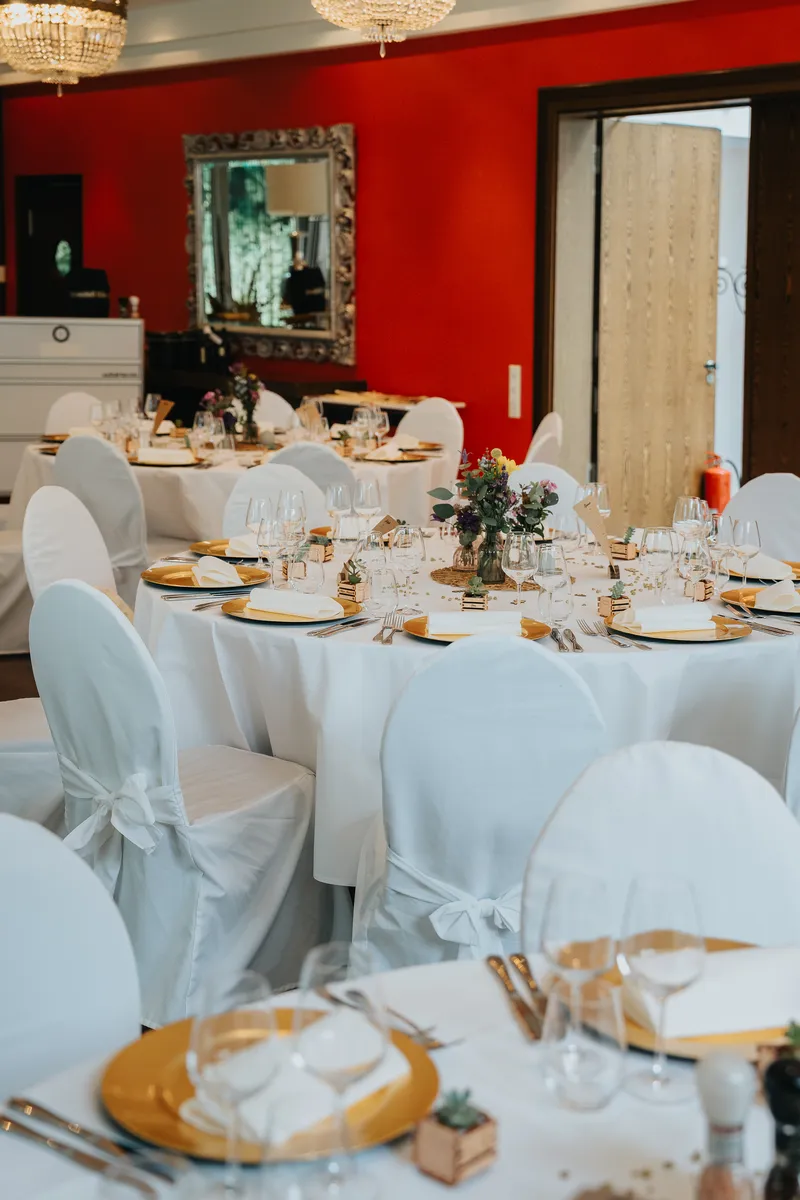 Ein weiteres Highlight folgte mit dem Kuchenanschnitt, bei dem Lena & Flo zusammen ihr süßes Highlight vorstellten – ein liebevoller Übergang von Empfang zur Feier. Danach öffnete sich der Blick in den festlich dekorierten Saal: Kronleuchter, florale Akzente und historische Elemente sorgten für echtes Sommerhochzeits-Feeling.
