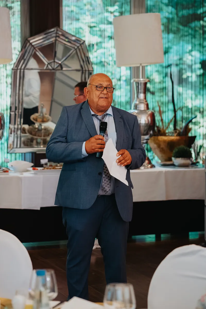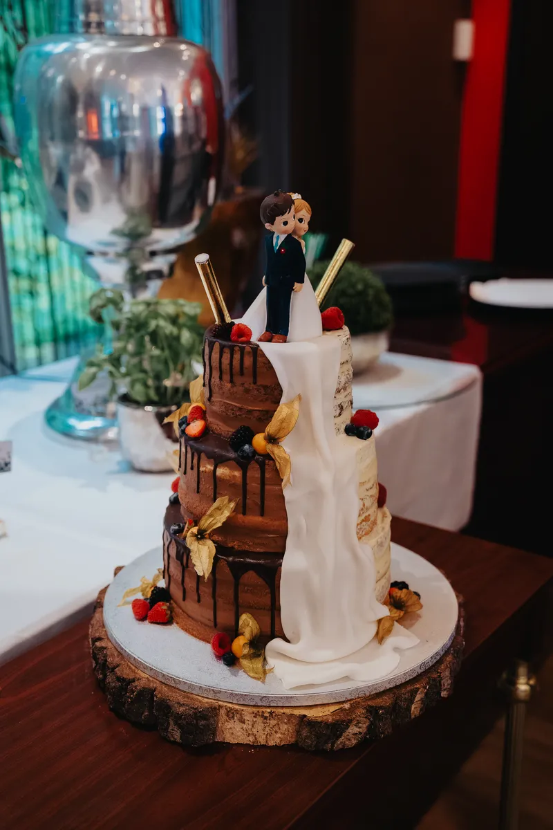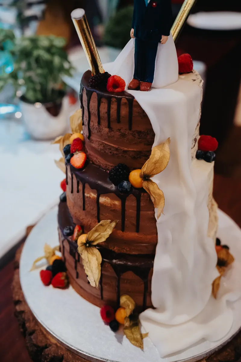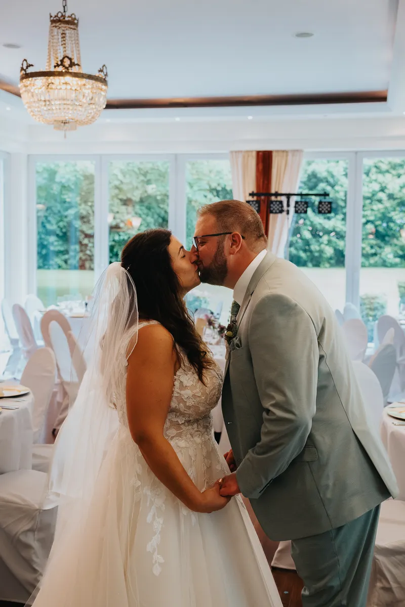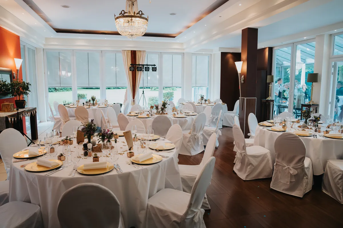 Ein weiteres Highlight folgte mit dem Kuchenanschnitt, bei dem Lena & Flo zusammen ihr süßes Highlight vorstellten – ein liebevoller Übergang von Empfang zur Feier. Danach öffnete sich der Blick in den festlich dekorierten Saal: Kronleuchter, florale Akzente und historische Elemente sorgten für echtes Sommerhochzeits-Feeling.