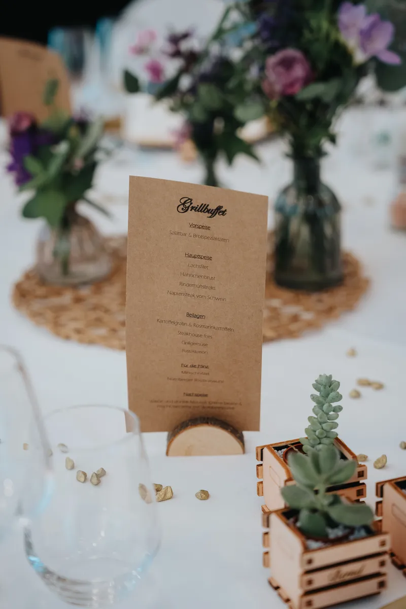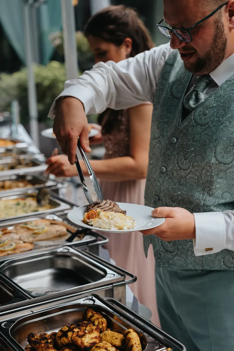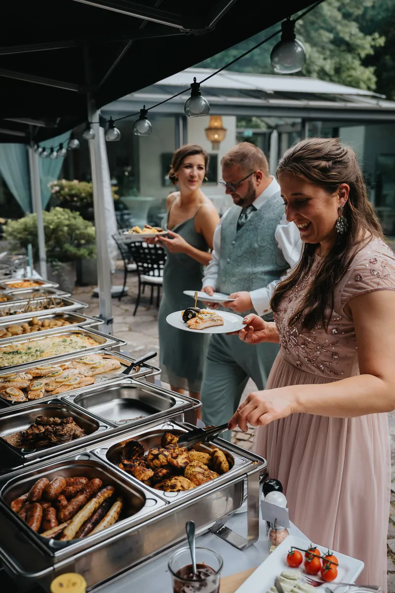 Nach dem Shooting ging es zurück zum festlich vorbereiteten Saal im Klosterhof Seligenthal, wo das umfangreiche Grillbuffet wartete. Die Tische waren liebevoll dekoriert, die Stimmung gelöst – und die Gäste freuten sich auf gutes Essen und einen stimmungsvollen Abend.