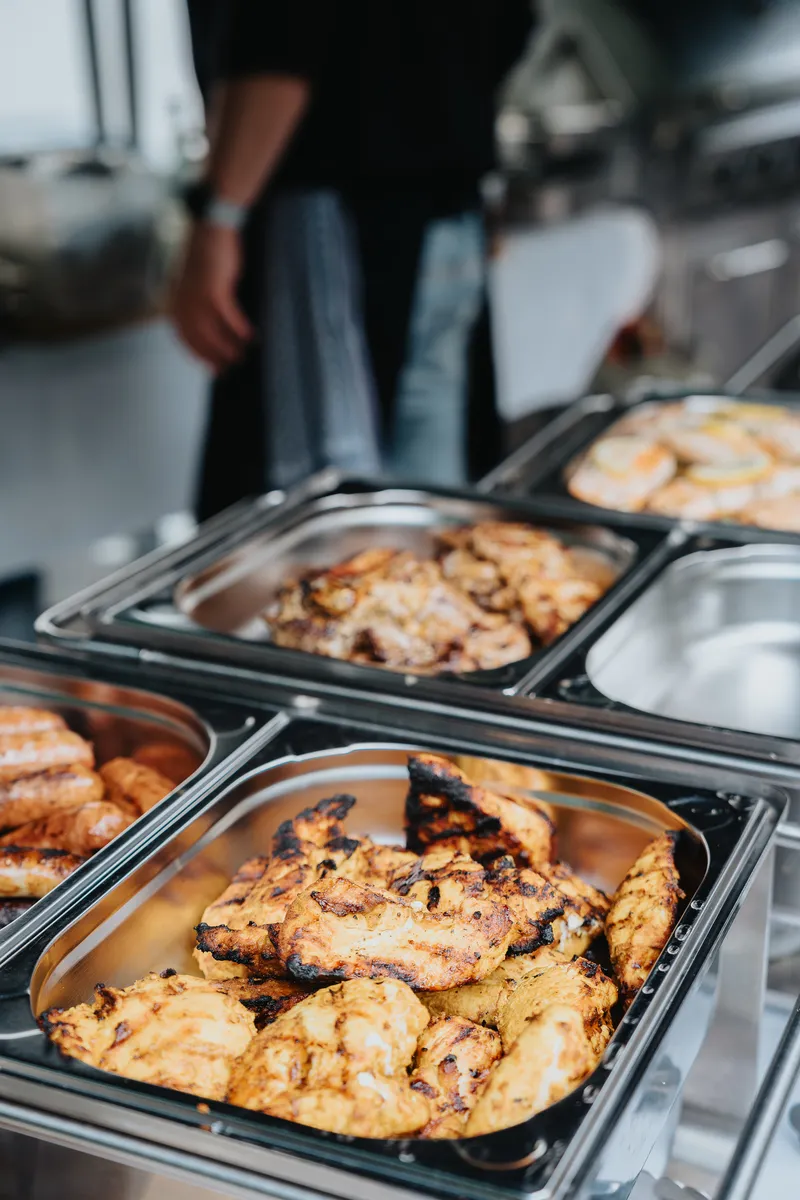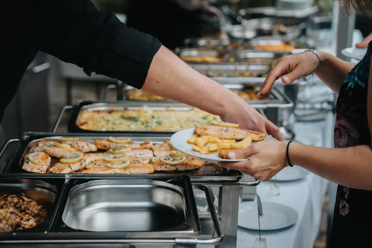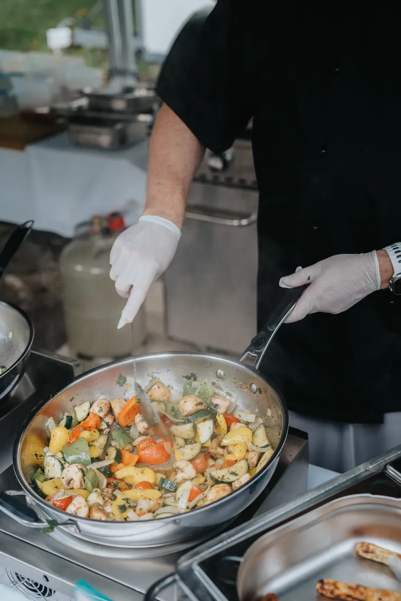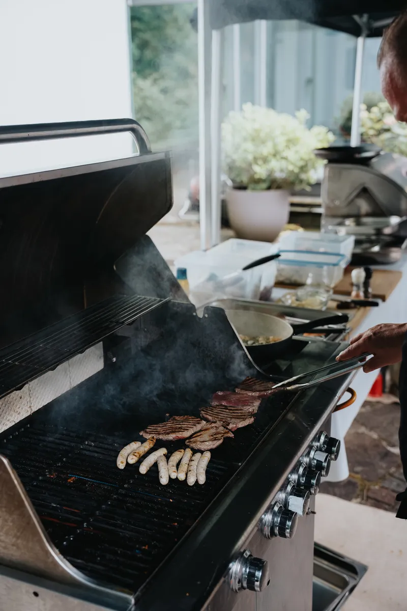Nach dem Shooting ging es zurück zum festlich vorbereiteten Saal im Klosterhof Seligenthal, wo das umfangreiche Grillbuffet wartete. Die Tische waren liebevoll dekoriert, die Stimmung gelöst – und die Gäste freuten sich auf gutes Essen und einen stimmungsvollen Abend.