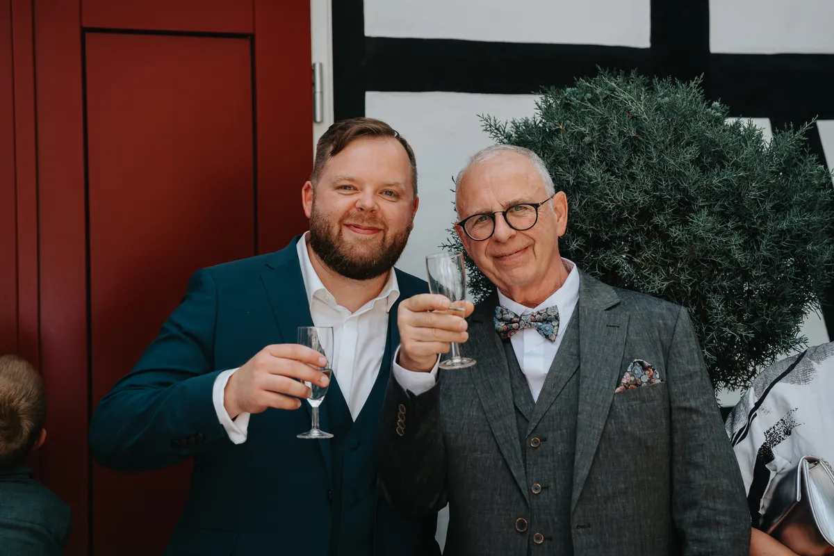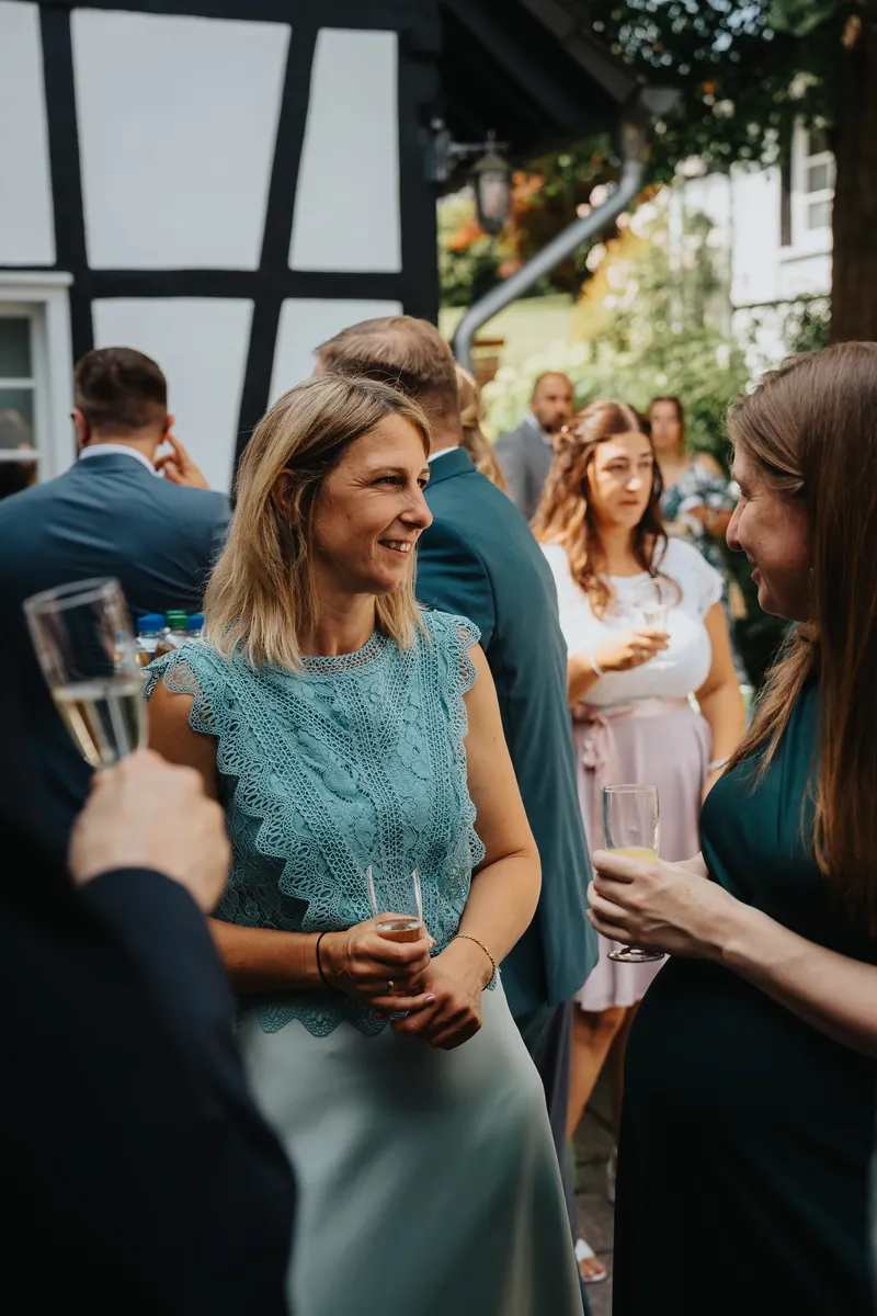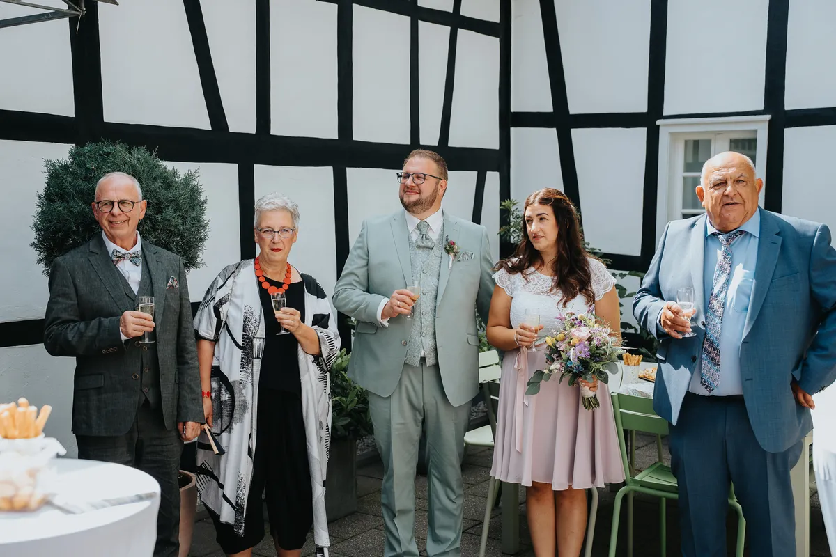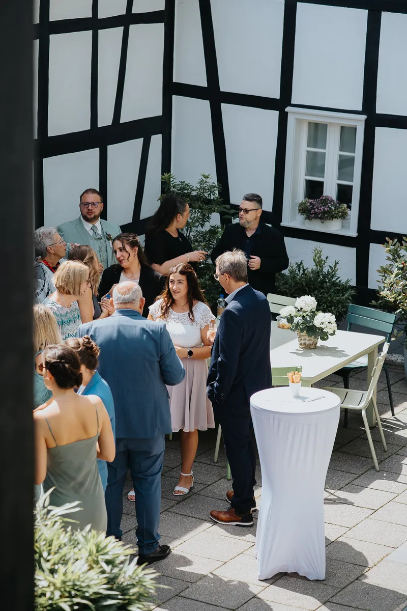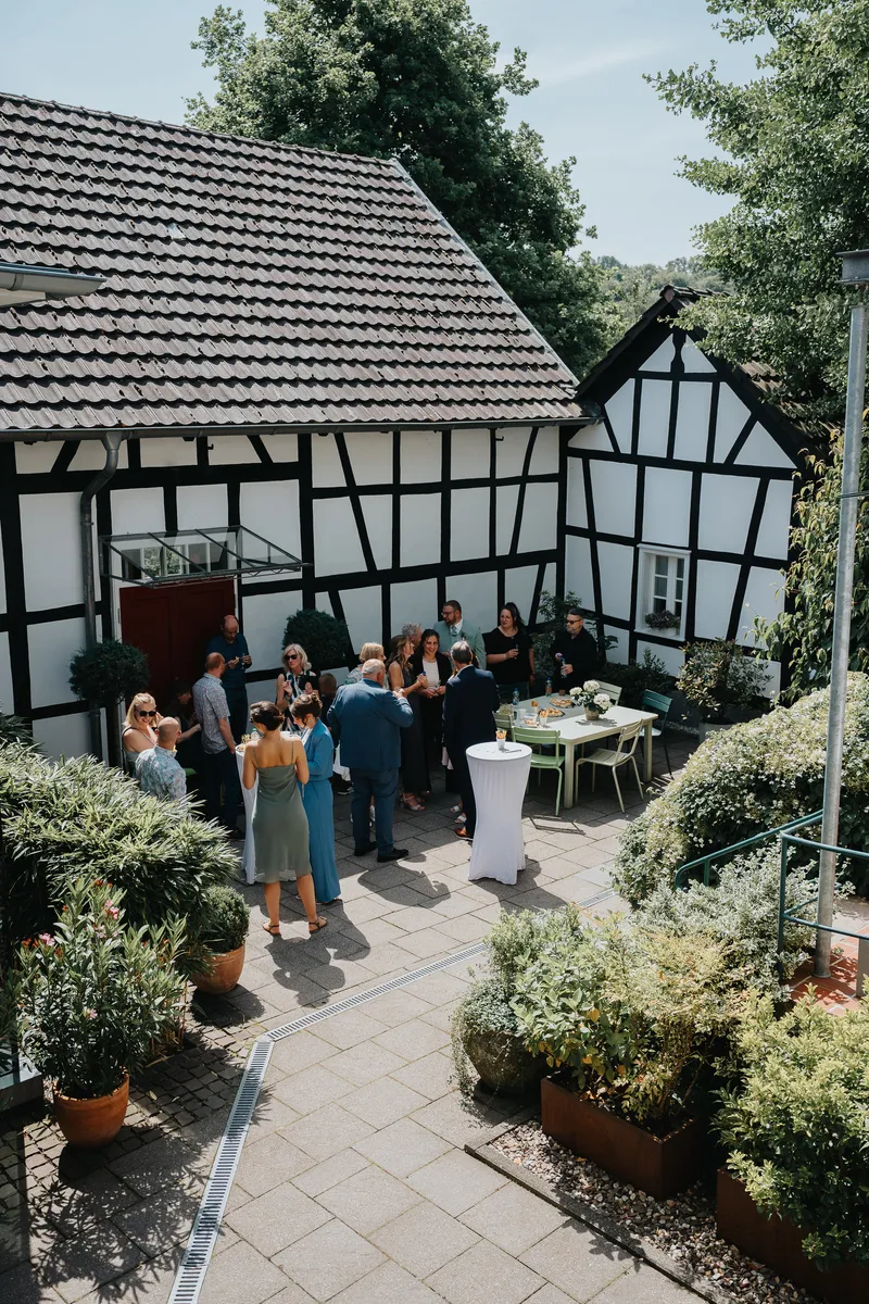 Direkt nach der Trauung ging es für alle Gäste in den Innenhof des Haus in Bewegung, der mit seinem Kopfsteinpflaster, der offenen Remise und dem kleinen Brunnen eine ganz besondere Kulisse bot. Die Sonne stand inzwischen hoch, die Stimmung war gelöst – und die ersten Gläser Sekt klirrten im Schatten der alten Mauern.