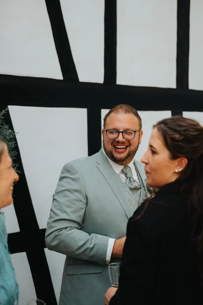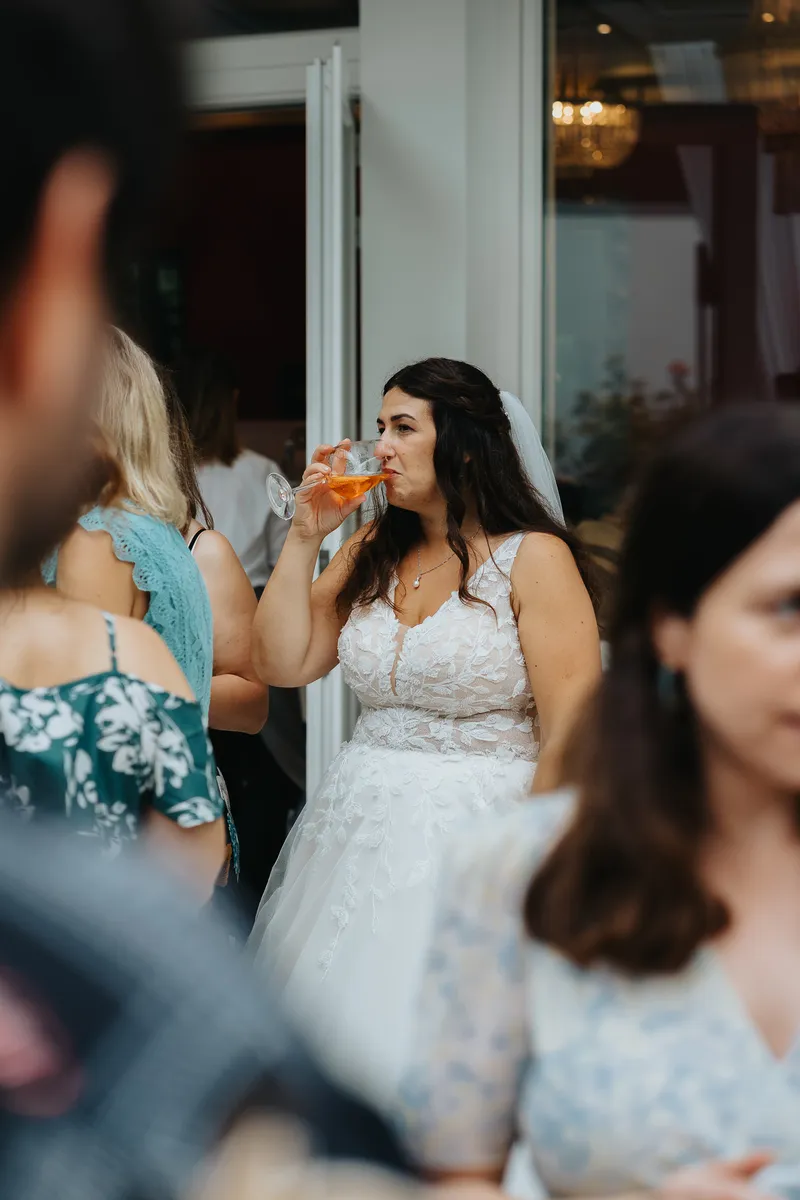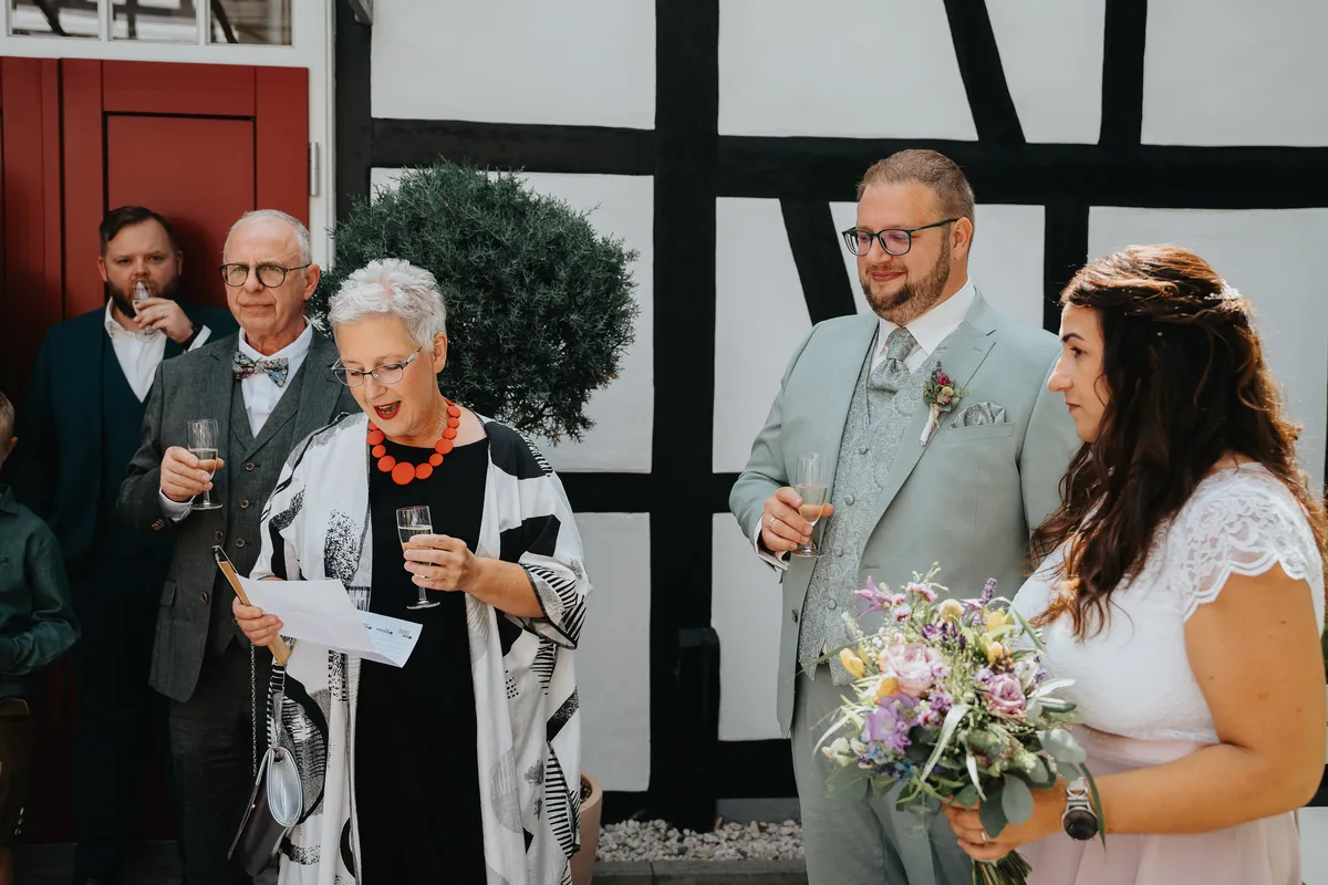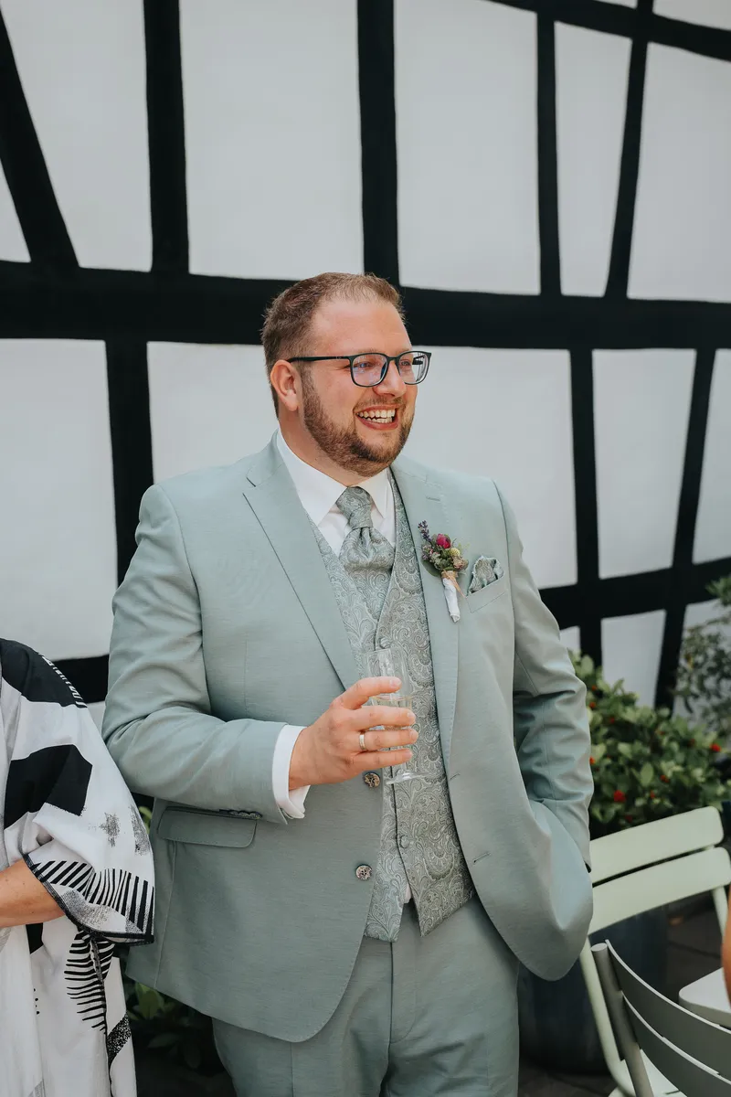 Direkt nach der Trauung ging es für alle Gäste in den Innenhof des Haus in Bewegung, der mit seinem Kopfsteinpflaster, der offenen Remise und dem kleinen Brunnen eine ganz besondere Kulisse bot. Die Sonne stand inzwischen hoch, die Stimmung war gelöst – und die ersten Gläser Sekt klirrten im Schatten der alten Mauern.