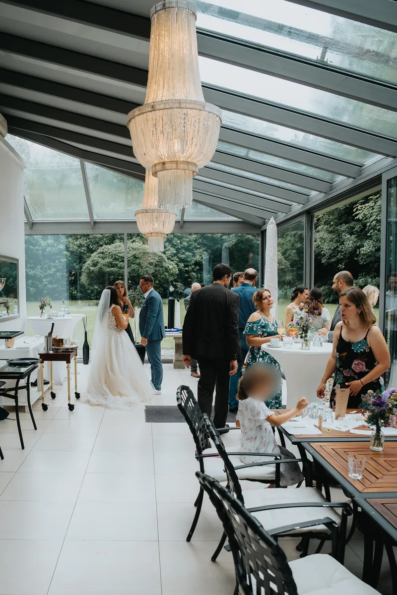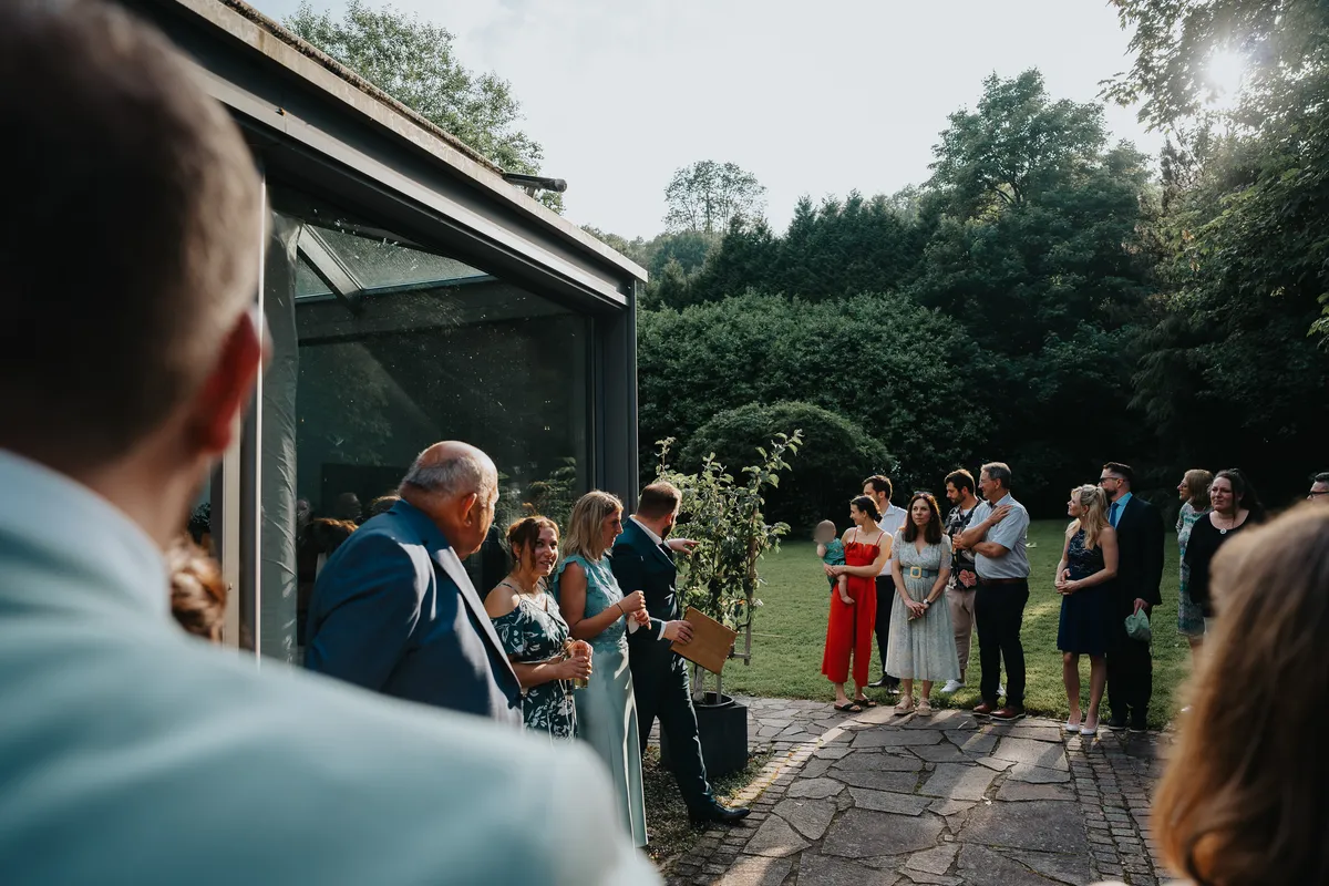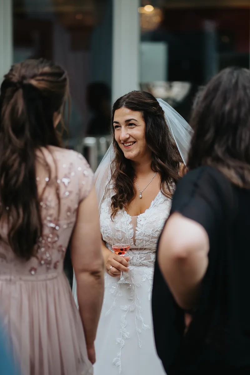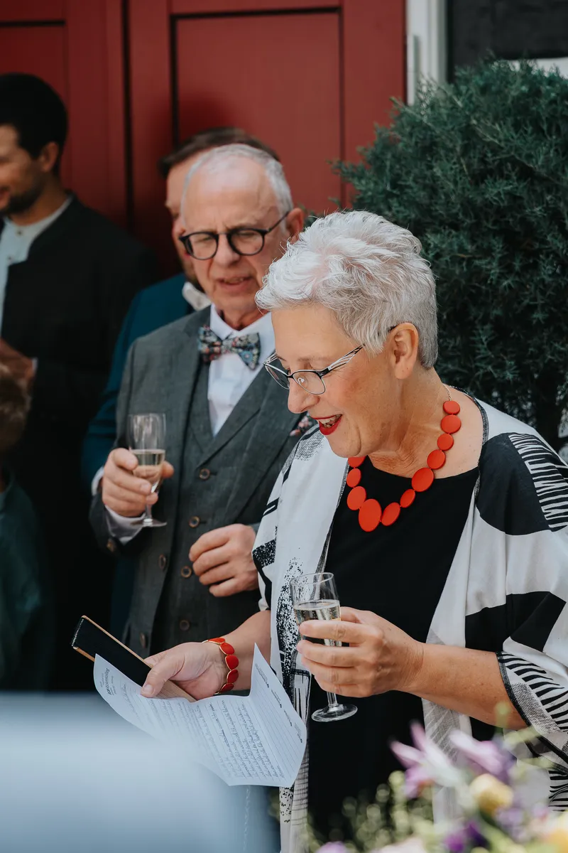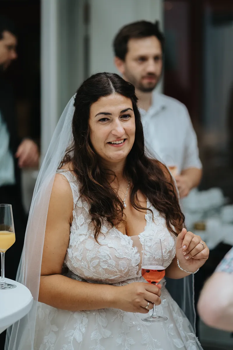 Direkt nach der Trauung ging es für alle Gäste in den Innenhof des Haus in Bewegung, der mit seinem Kopfsteinpflaster, der offenen Remise und dem kleinen Brunnen eine ganz besondere Kulisse bot. Die Sonne stand inzwischen hoch, die Stimmung war gelöst – und die ersten Gläser Sekt klirrten im Schatten der alten Mauern.