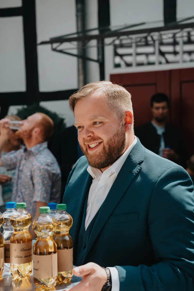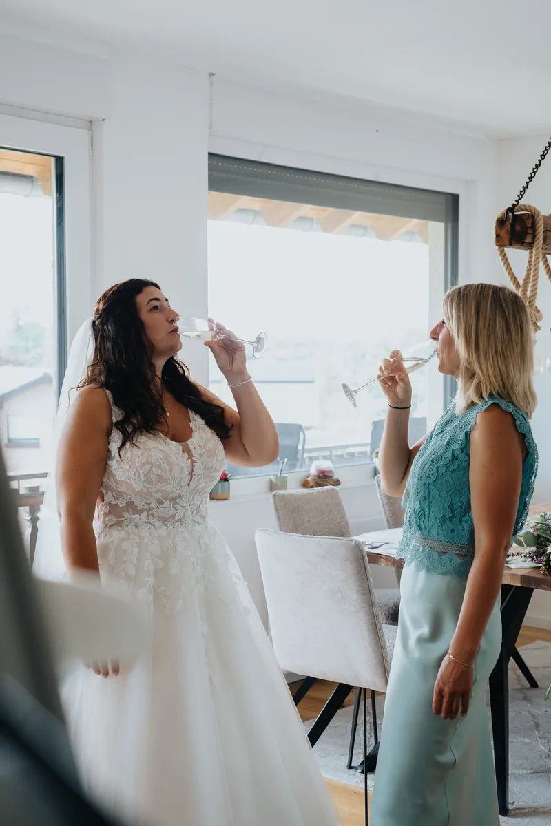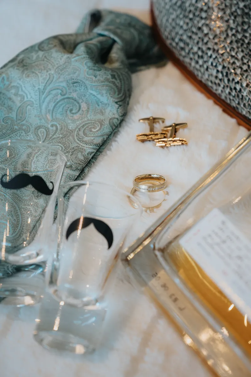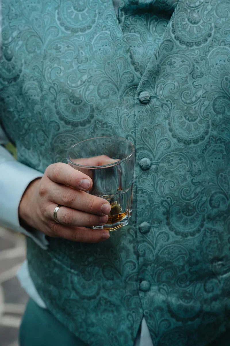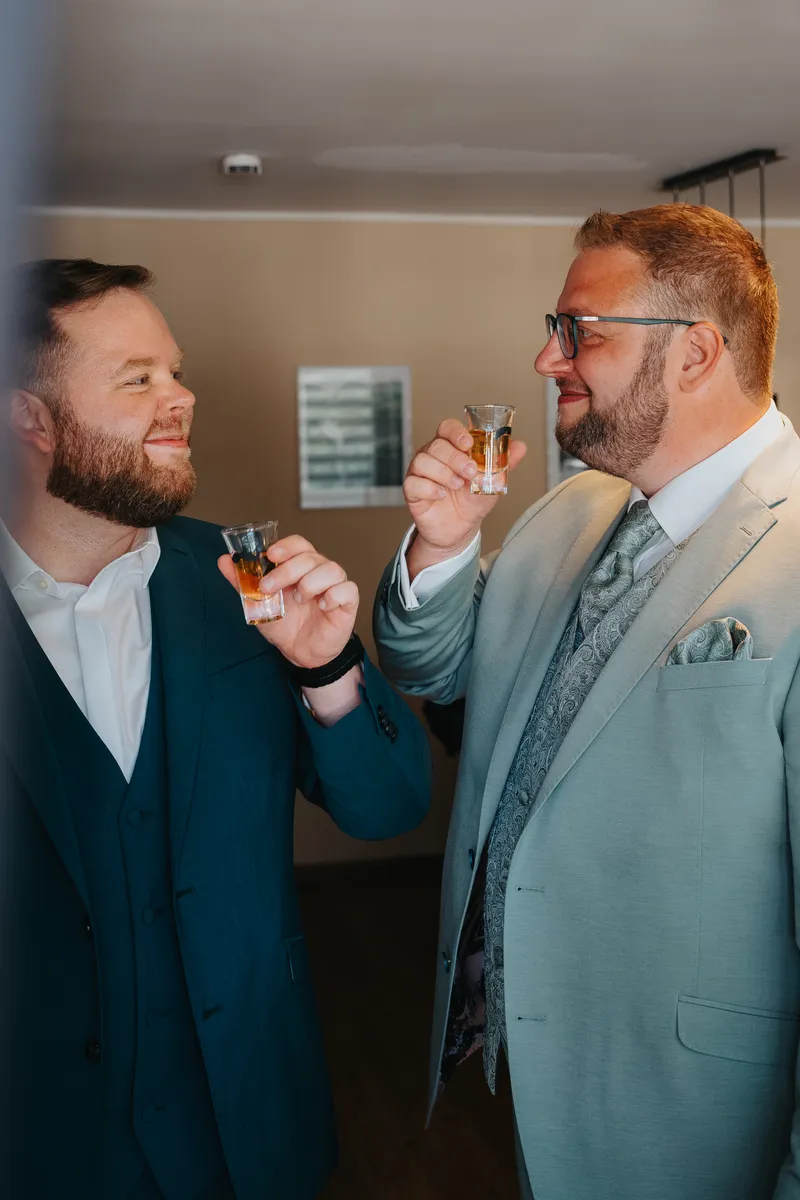Vor einiger Zeit hatte Flo seinem Trauzeugen eine Flasche Rum geschenkt – verbunden mit der Frage, ob er ihn an diesem Tag begleiten möchte. Über die Monate bis zur Hochzeit wurde bei besonderen Gelegenheiten immer wieder daraus getrunken. Am Hochzeitsmorgen waren dann die letzten beiden Gläser dran – ein persönlicher Moment voller Bedeutung, der ganz ohne große Worte auskam.