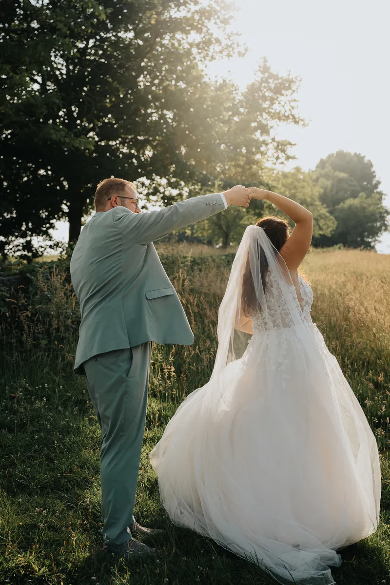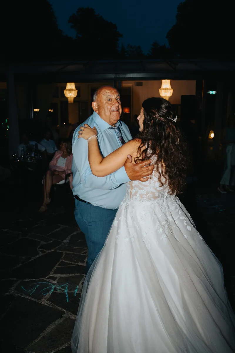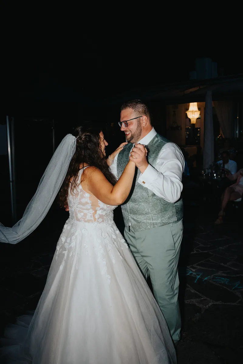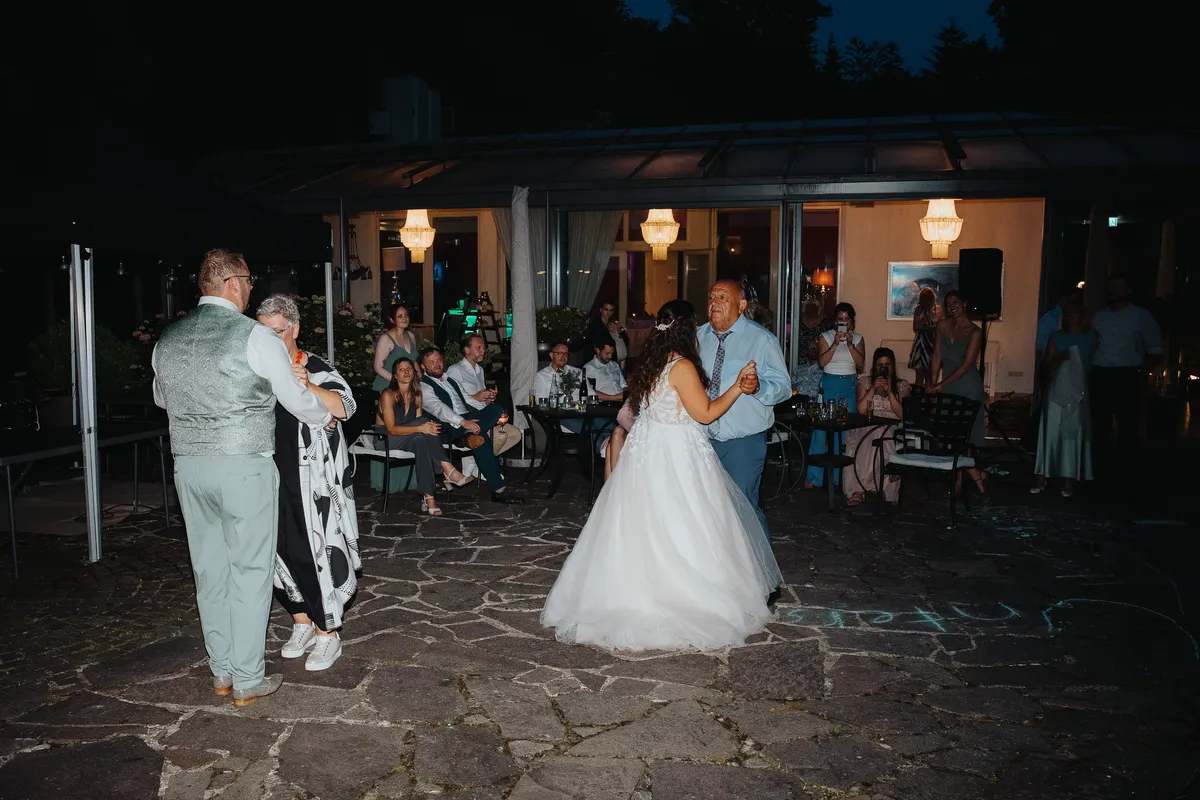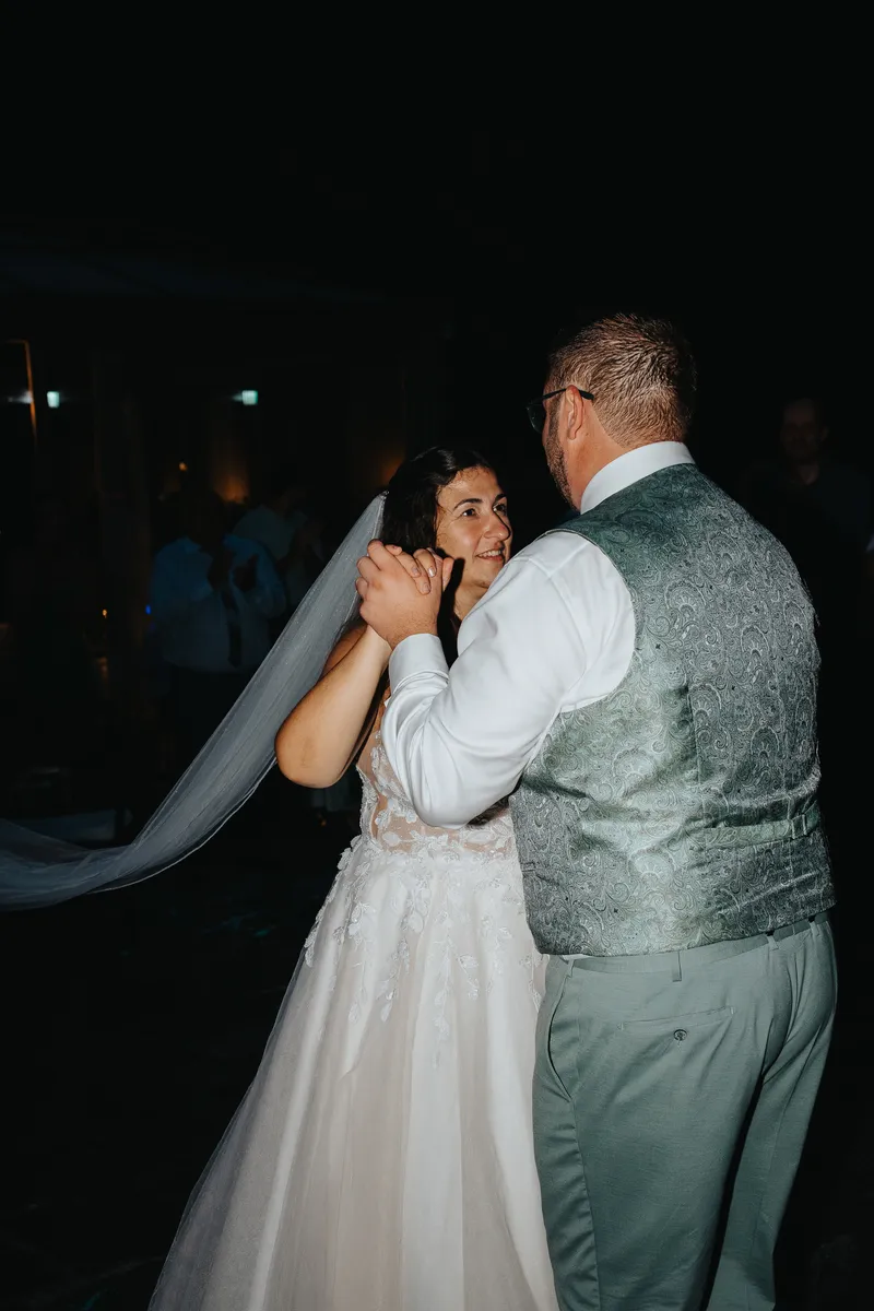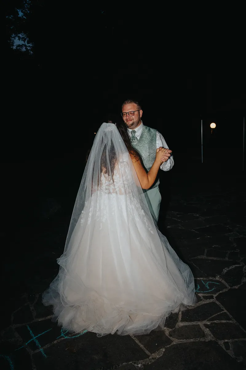 Danach stand eigentlich der First Dance auf dem Programm – doch weil es im Saal noch sehr warm war, wurde spontan umgeplant. Die Tanzfläche wurde kurzerhand nach draußen verlegt. Und dort, unter freiem Himmel, tanzten Lena & Flo ihren ersten Tanz – ungestellt, entspannt, einfach schön.