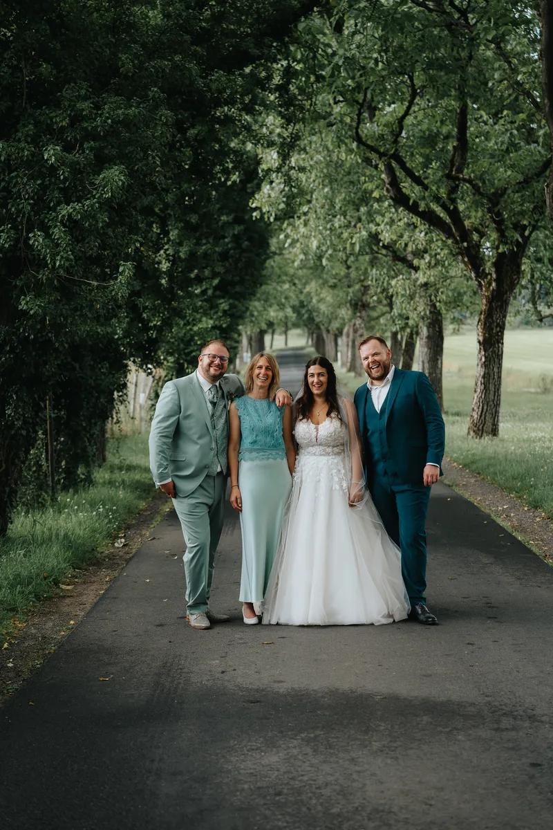 Für das Brautpaarshooting fuhren wir gemeinsam oberhalb der Wahnbachtalsperre, wo sich ein wunderschöner Ausblick und viel Grün boten. Bevor wir loslegten, machten wir noch einige Gruppenfotos mit der engsten Familie – ein ruhiger Moment im kleineren Kreis, bevor es weiterging.