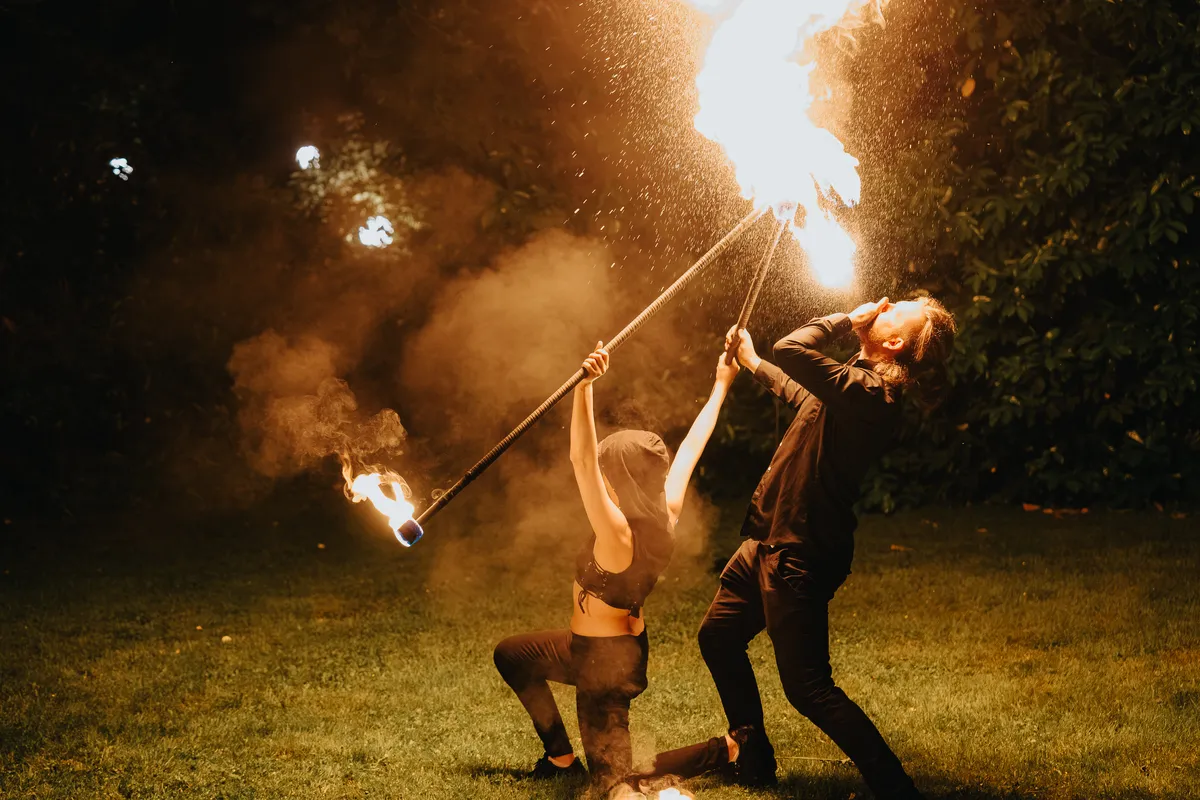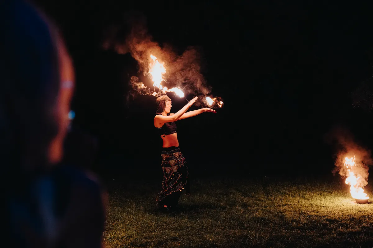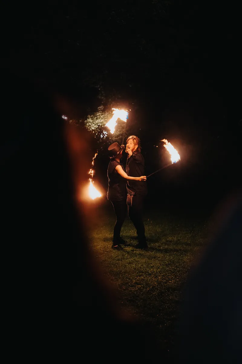 Als es langsam dunkel wurde, wartete noch ein ganz besonderes Highlight auf Lena & Flo – von den Trauzeugen organisiert und für alle Gäste eine echte Überraschung: eine professionelle Feuershow mit Choreographie, Jonglage und eindrucksvollen Lichteffekten.