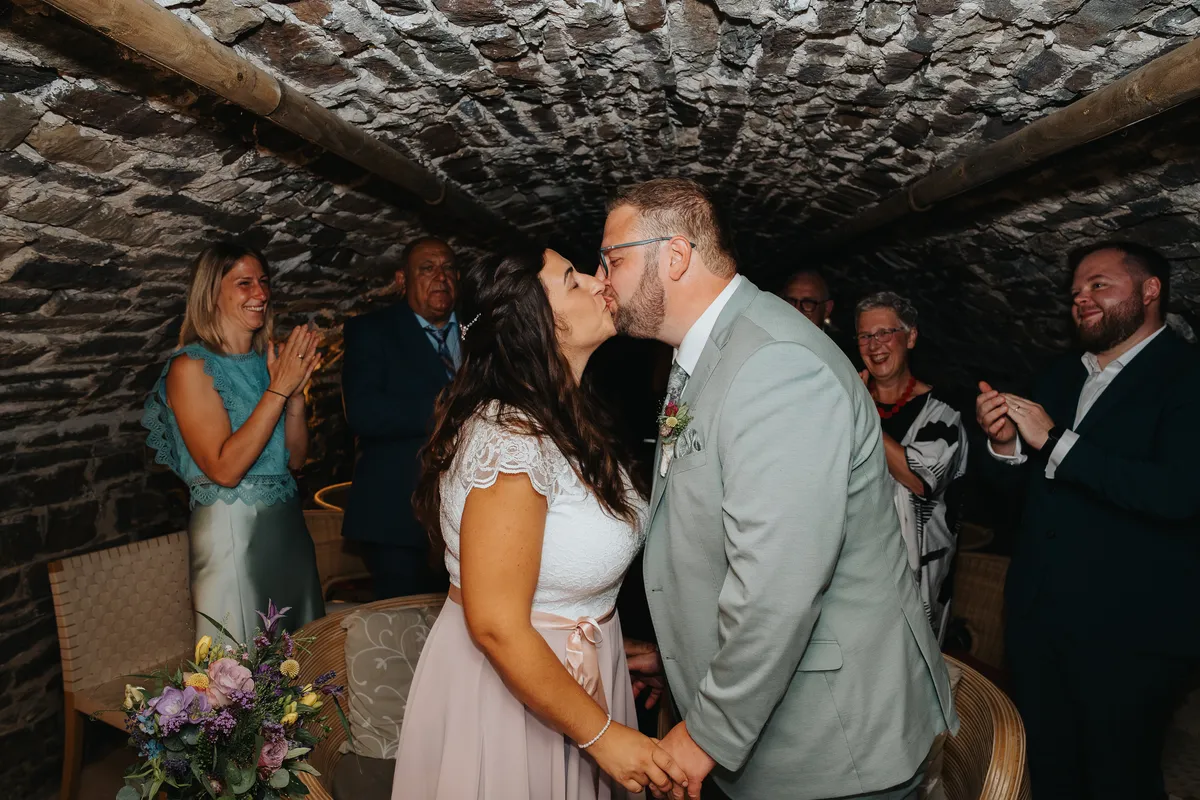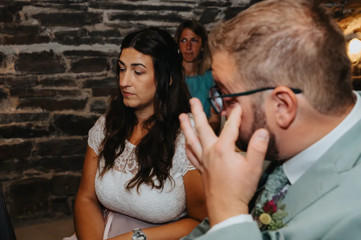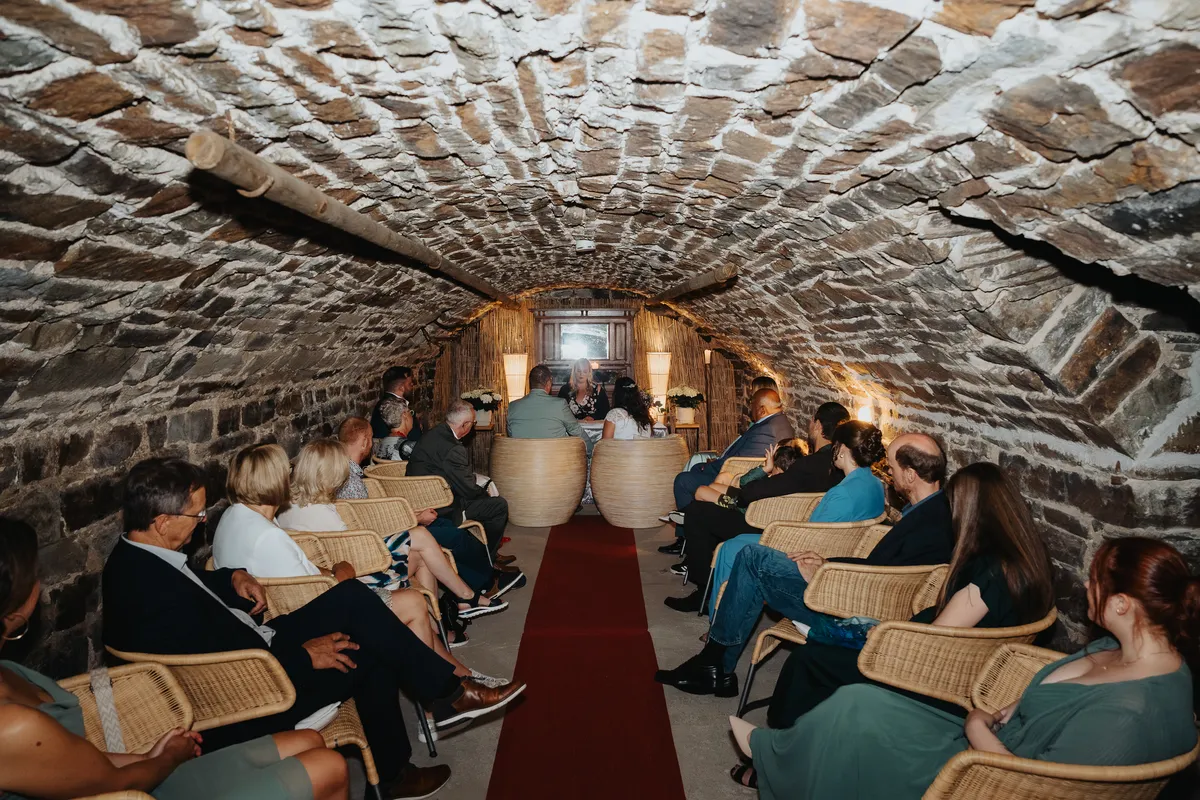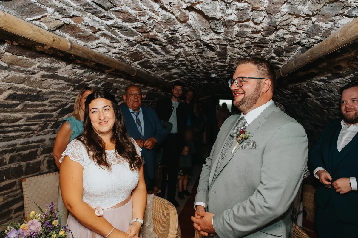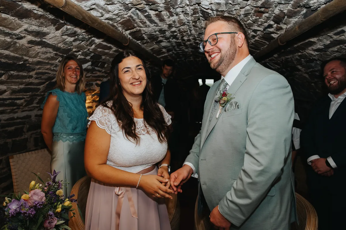 Um 11 Uhr begann der offizielle Teil des Tages: die standesamtliche Trauung im Haus in Bewegung in Neunkirchen-Seelscheid. Nicht wie sonst oft im hellen Rathauszimmer, sondern in einem ganz besonderen Raum – dem historischen Gewölbekeller.