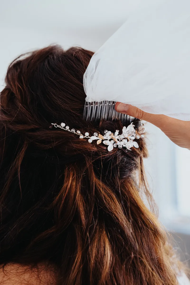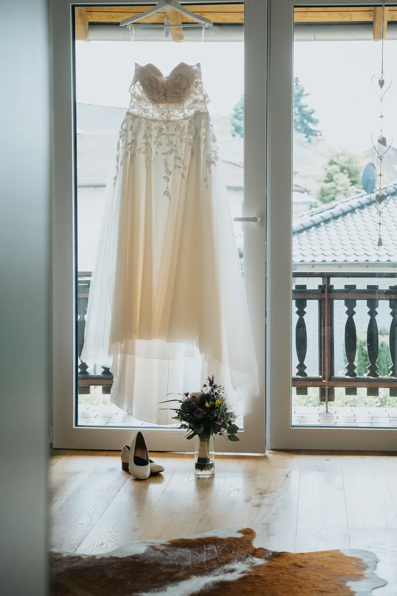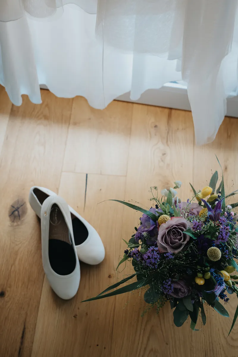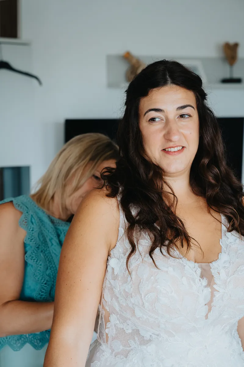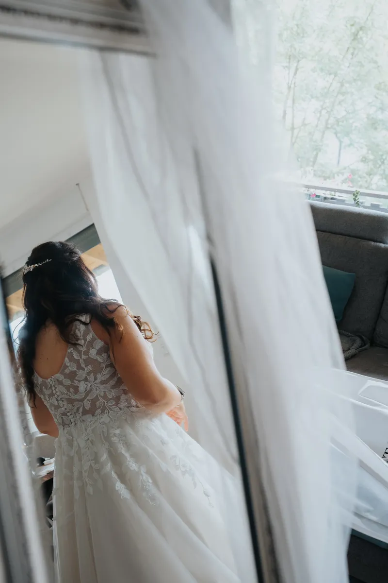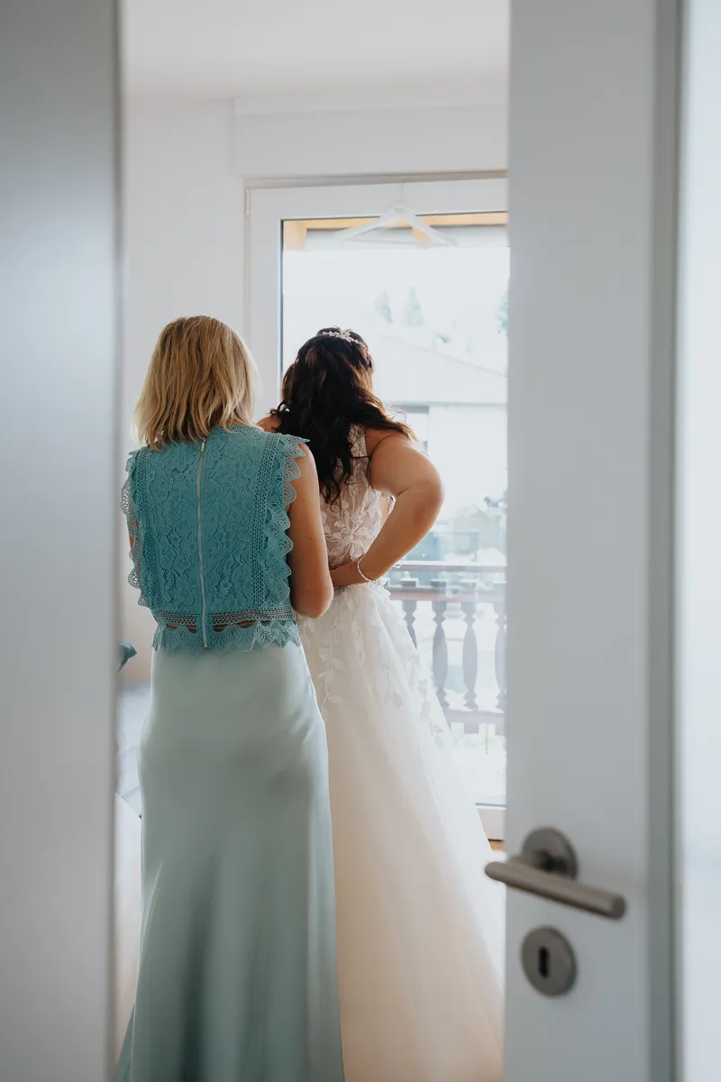 Nach der standesamtlichen Trauung war etwas Zeit, bevor es zur Kirche ging – und die nutzte die Braut, um sich umzuziehen und für die zweite Zeremonie des Tages vorzubereiten. Ich begleitete sie dabei zusammen mit ihrer Schwester und Trauzeugin.